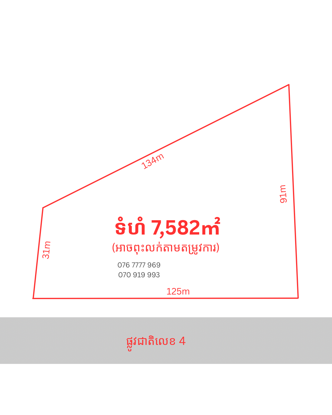 ដី សម្រាប់លក់ ក្រុងព្រះសីហនុ (ស្ថិតលេីផ្លូវជាតិលេខ4) 📍ភូមិ1 សង្កាត់លេខ1 ស្រុកព្រះសីហនុ ក្រុងព្រះសីហនុ ✅ប្រភេទដីលំនៅឋាន ✅តំលៃ 370/㎡ ✅ទំហំដី សរុប 7,582㎡ ✅ក្បាលដីជាប់ផ្លូវជាតិលេខ4 ក្បាលដី125m (អាចពុះលក់តាមតម្រូវការ) ⭐️ទីតាំងល្អ នៅក្បែរទីប្រជុំជន អាចសង់អាគារ ការយាល័យ ខុនដូរ -ល- 👉ផ្ទេរប្លង់កម្មសិទ្ធ L-Map ជូន ⭐️ទិញ លក់ ជួល - អចលទ្រព្យគ្រប់ប្រភេទ ✨សំរាប់ព័ត៌មានបន្ថែម៖ / Contact info : 📞 0767777xxxClick To Call / 070919xxxClick To Call