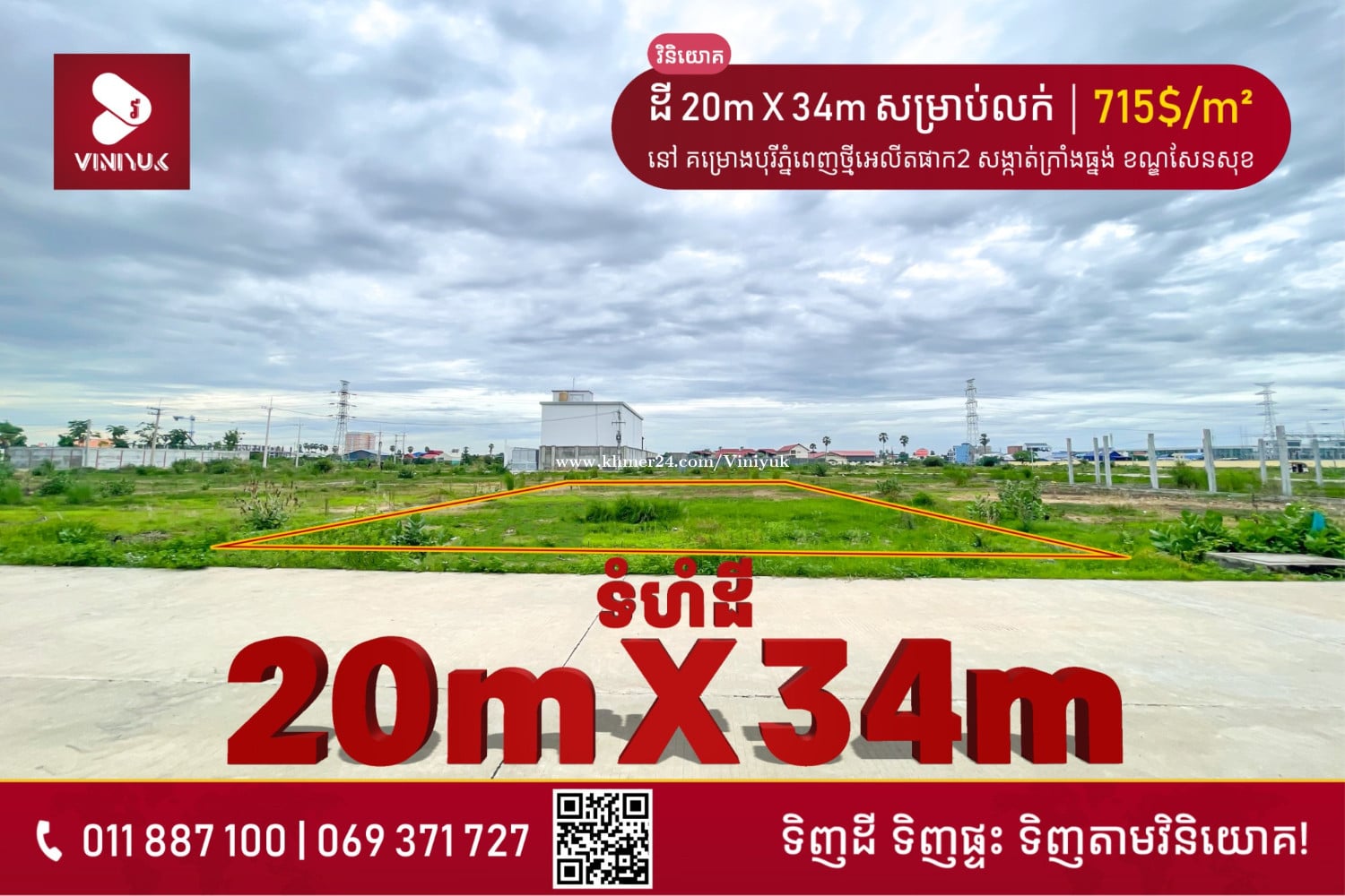 ដី សម្រាប់លក់ !! - ទីតាំង ៖ នៅសង្កាត់ក្រាំងធ្នង់ ខណ្ឌសែនសុខ គម្រោងបុរីភ្នំពេញថ្មីអេលីតផាក2 - ទំហំ ៖ 20m X 34m (ក្នុងប្លង់រឹង680ម៉ែត្រការ៉េ) - តម្លៃ ៖ 715$/m² (ចរចា) - ប្លង់រឹង L-Map - ផ្លូវមុខដីទំហំ 8ម៉ែត្រ - លេខអាជ្ញាប័ណ្ណ : E-22-404