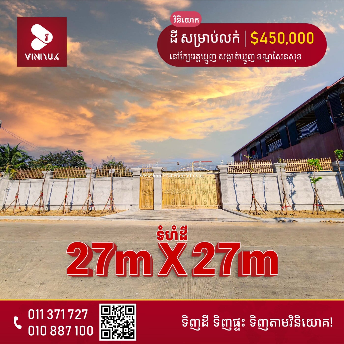 🏡ដី សម្រាប់លក់ !! 📍ទីតាំង ៖ នៅក្បែរវត្តឃ្មួញ សង្កាត់ឃ្មួញ ខណ្ឌសែនសុខ - តម្លៃលក់ : $450,000 ចរចារ (ប្លង់រឹង) - ទំហំដី ៖ 27m X 27m - ទីតាំង អាចសង់ជាវិឡា , ធ្វើឃ្លាំងស្តុកអីវ៉ាន់ - ផ្លូវបេតុង - បែបទិសជើង - លេខអាជ្ញាប័ណ្ណ : E-22-404