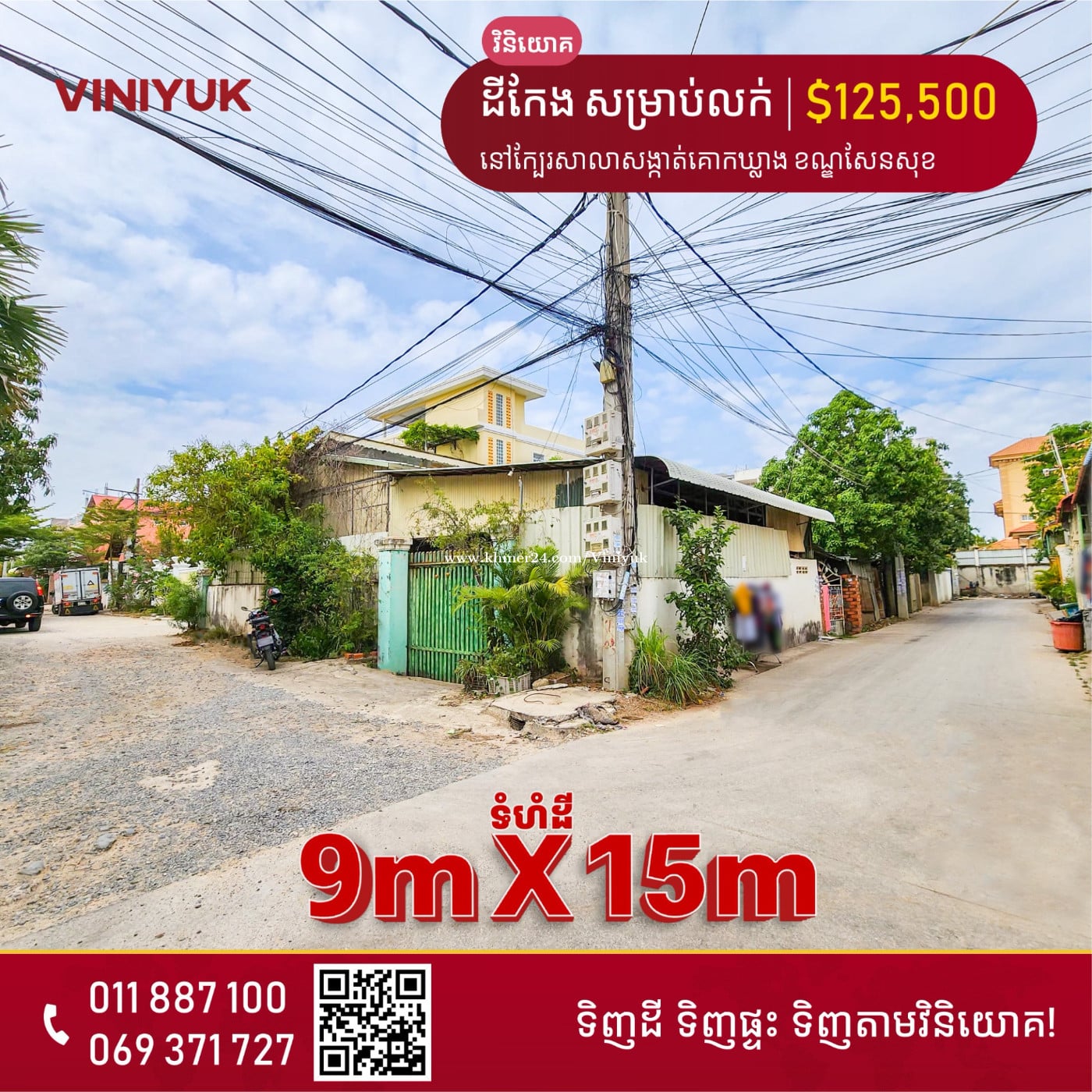 🏡ដី សម្រាប់លក់ !! 📍ទីតាំង ៖ នៅក្បែរសាលាសង្កាត់គោកឃ្លាង សង្កាត់គោកឃ្លាង ខណ្ឌសែនសុខ រាជធានីភ្នំពេញ - តម្លៃលក់ : $125,500 ចរចា - ទំហំដី : 9m x 15m - កាត់ប្លង់រឹងជូន - ទីតាំងដី សក្តានុពល មានផ្លូវចេញចូលអត់ទល់ - លេខអាជ្ញាប័ណ្ណ : E-22-404