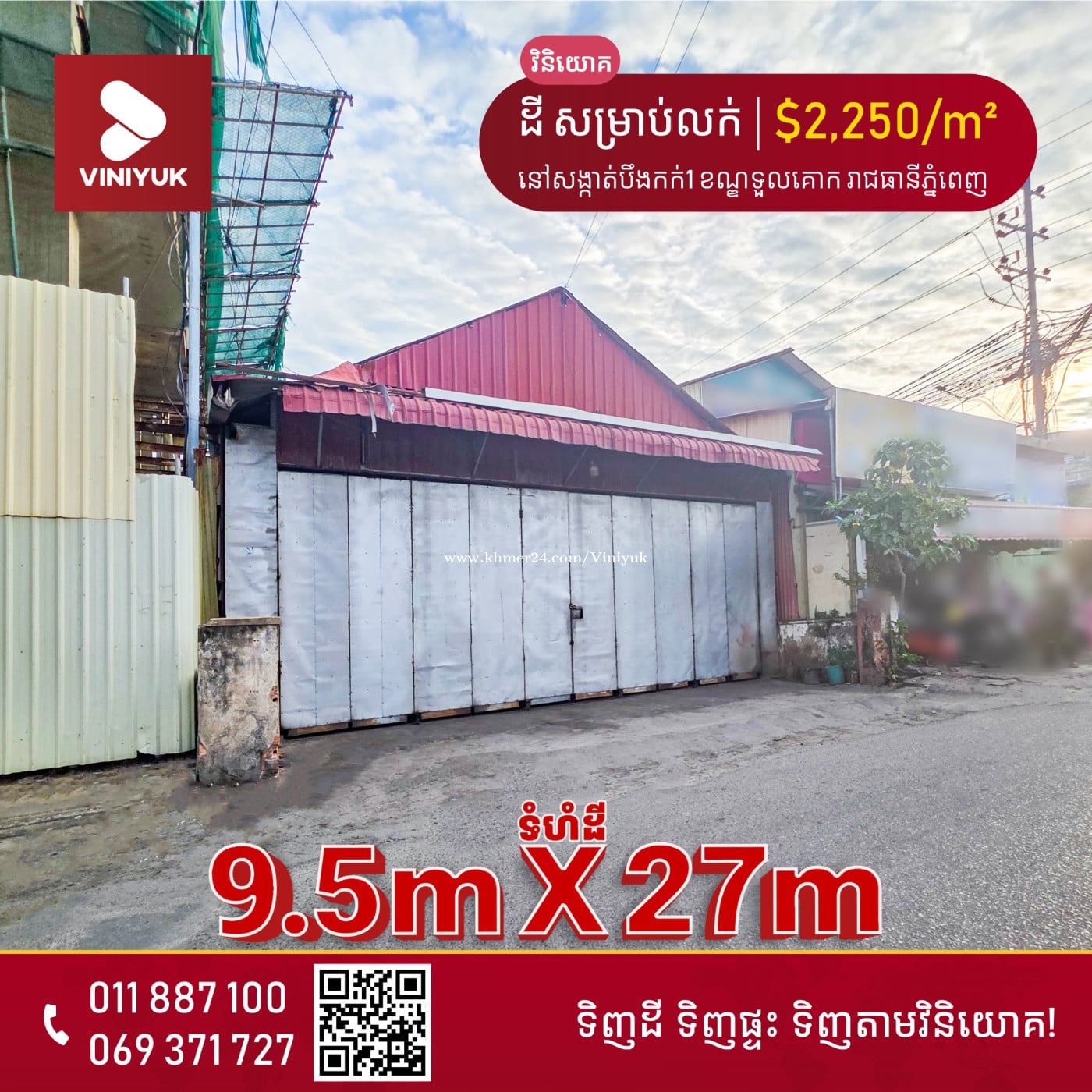🏡ដី សម្រាប់លក/ជួល!! 📍ទីតាំង ៖ នៅសង្កាត់បឹងកក់ទី1 ខណ្ឌទួលគោក រាជធានីភ្នំពេញ - តម្លៃលក់ : $2,250/m² ចរចា - ទំហំដី ៖ 9,5m x 27m (ទំហំក្នុងប្លង់ : 234m²) - ទិសបែរខាងជើង - លេខអាជ្ញាប័ណ្ណ : E-22-404