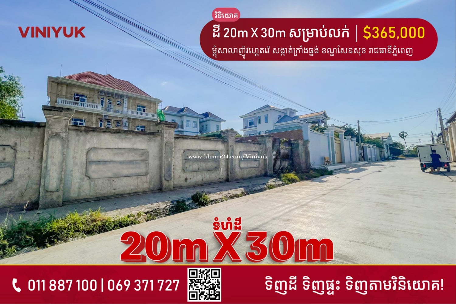 🏡ដី សម្រាប់លក់!! 📍ទីតាំង ៖ នៅម្តុំសាលាញ៉ូវហ្គេតវ៉េ សង្កាត់ក្រាំងធ្នង់ ខណ្ឌសែនសុខ រាជធានីភ្នំពេញ - ទំហំ ៖ 20m X 30m (ក្នុងប្លង់635m²) - តម្លៃ ៖ $365,000 (ចរចា) - កាត់ប្លង់រឹងជូន - ផ្លូវមុខដីទំហំ 8 ម៉ែត្រ - ទិសបែរជើង - លេខអាជ្ញាប័ណ្ណ : E-22-404