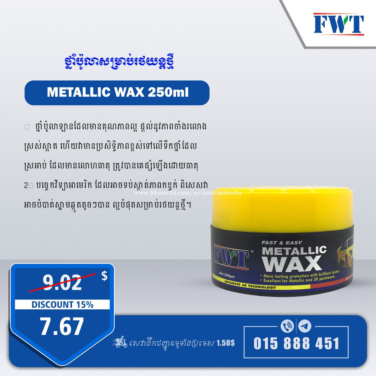 ផលិតផលថែទំារថយន្ត Archele គុណភាពខ្ពស់ ស្តង់ដាអន្តរជាតិ ប្រម៉ូសិនលក់បញ្ចុះតម្លៃ 15% គ្រប់មុខទំនិញ❤️ 👉ព័ត៌មានបន្ថែម: 015888xxxClick To Call (Telegram) 👉 https://t.me/+KCE6vQmDwpBmOTY1