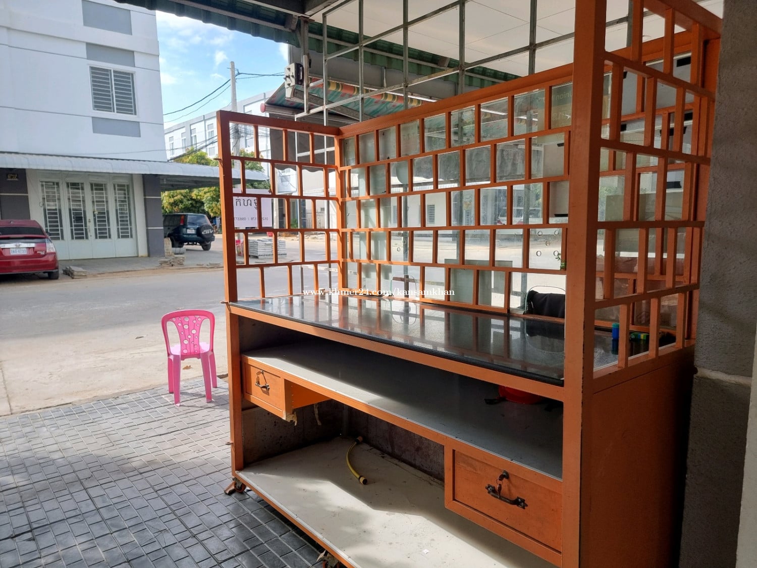 ខ្នាត ប=2មែត្រជាង×ទ=1មែត្រ×កំពស់=2មែត្រ មានថតខាងក្រោម ក្រាលម៉ាបខាងលើ កញ្ចក់ខាងមុខ មានកង់រុញងាយស្រួលបំលាស់ទី