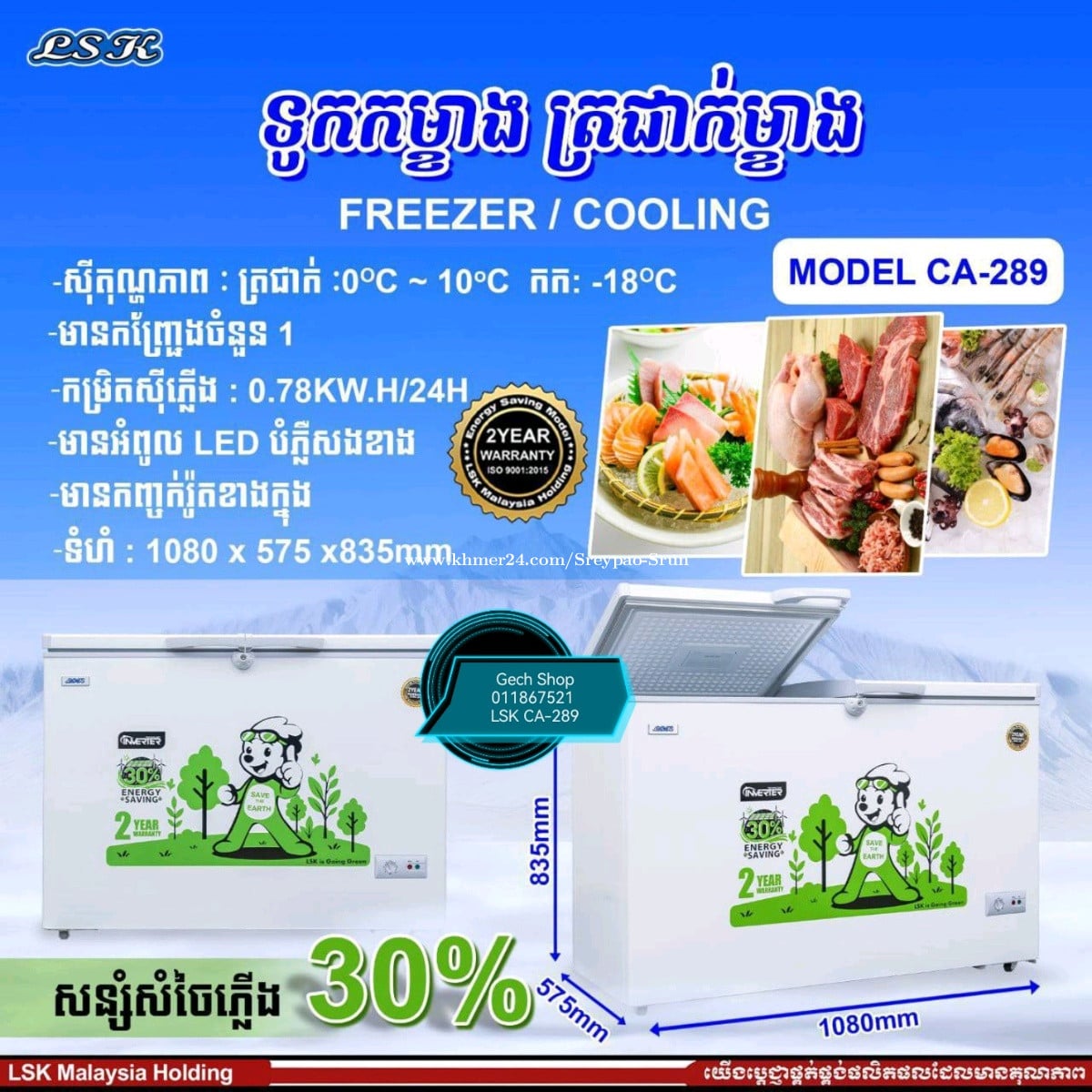 ទូរកកម្ខាង ត្រជាក់ម្ខាង Freezer / Cooler LSK CA-289 ប្រើប្រាស់កកម្ខាង ត្រជាក់ម្ខាង ងាយស្រួលប្រើប្រាស់ - សីតុណ្ហភាពត្រជាក់ 0អង្សារ ដល់-10អង្សារ កក-18អង្សារ - មានកញ្ជែងចំនួន ១ - មានអំពូល LED បំភ្លឺសងខាង - ទំហំ 1080x575x835mm មានលក់នៅហាង Gech Shop ធានាផលិតផលសុទ្ធពីក្រុមហ៊ុន តម្លៃសមរម្យ Tel: 011867xxxClick To Call ➡️📥📩 https://t.me/GechShop_PaoPao #freezer #coolers #LSK #lskmalaysia #ទូរកកម្ខាងត្រជាក់ម្ខាង