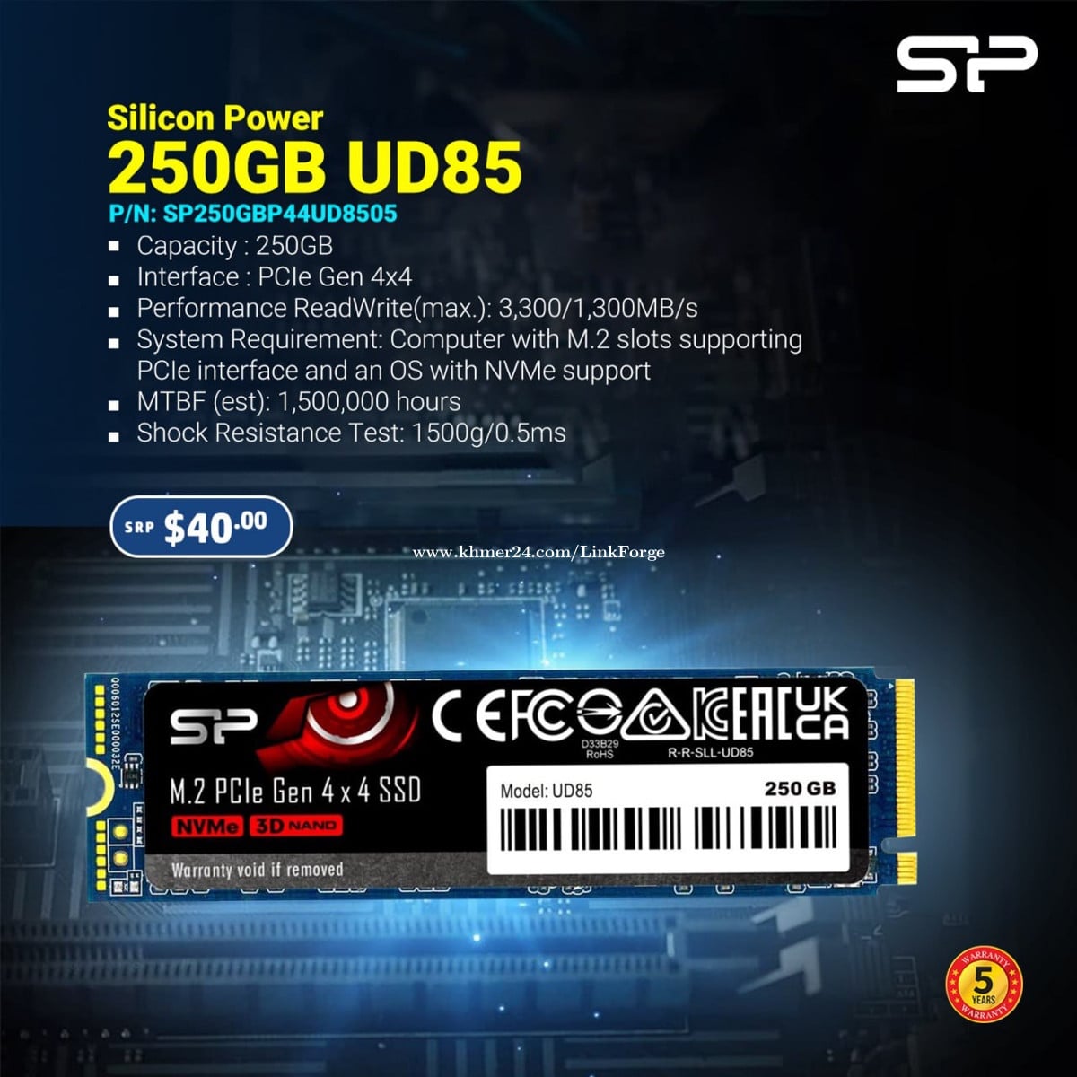 បង្កើនល្បឿនកុំព្យូទ័រនិងជួយពន្លឿនផលិតភាពការងារទ្វេដងជាមួយ 👇 Silicon Power UD85 PCIe Gen 4x4 NVMe™ SSD 🔹ទំហំ : 250GB 🔹Interface : PCIe Gen 4x4 🔹ល្បឿន Read/Write(max.):3300/1300MB/s 🔹អាយុកាលប្រើ: 1,500,000 hours 🔹ធានាជូនរយះពេល៥ឆ្នាំ 📱 Phone: +855714600xxxClick To Call 📨 Telegram: https://t.me/linkforgetechnology 🌐 Website: www.linkforgetechnology.com 📧 Email: inf*@linkforgetechnology.comClick To Sent Email 💬 Facebook Page Inbox: LinkForge Technology 🛒 Delivery available nationwide 📍 Address: Phnom Penh, Cambodia