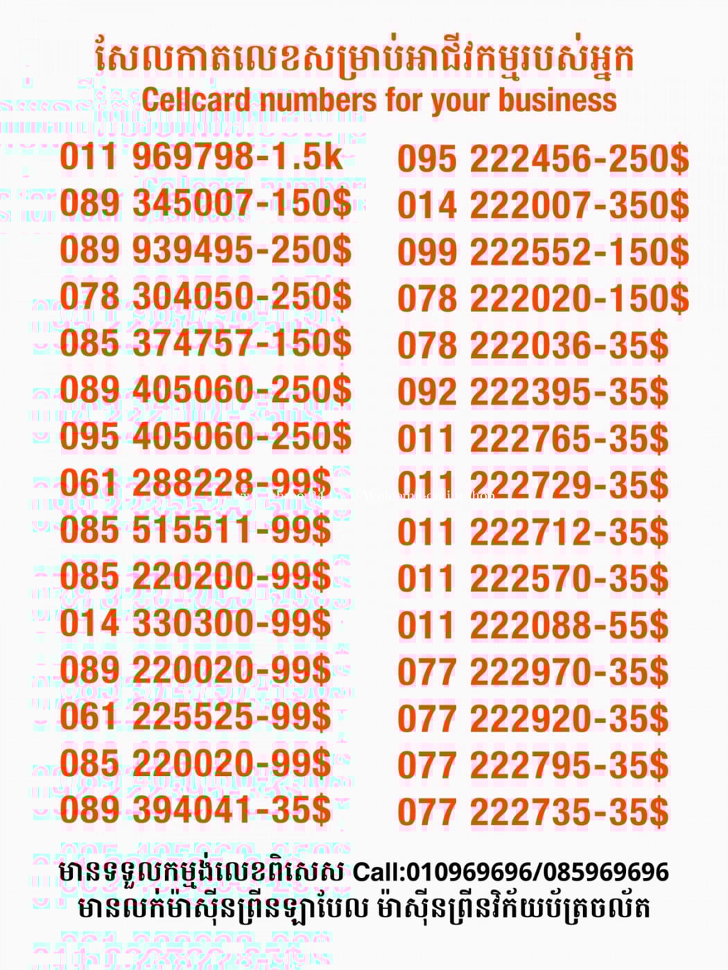 មានលក់លេខពិសេស មានទទួលកម្មង់លេខពិសេស មានលក់ម៉ាស៊ីនព្រីនឡាបែលចល័ត មានលក់ម៉ាស៊ីនព្រីនវិក័យប័ត្រចល័ត មានលក់សម្ភារៈប្រើប្រាស់ក្នុងគ្រួសារ Smart Prime II 1=30$ Smart hero 1=40$ ទូរសព្ទថ្មីក្នុងប្រអប់ លក់ធូរៗរហូតអស់ពីស្តុក អាចប្រើជាឧបករណ៍សម្រាប់ស៊ែរ wifi បាន ទំនាក់ទំនង(ខ្មែរ | English | 中文):010969696 | 085969696 Telegram: https://t.me/W9696 Telegram group: https://t.me/konkonnada អាសយដ្ឋាន:ផ្ទះលេខ២៣ ផ្លូវបេតុងលេខ១ ភូមិទួលពង្រ សង្កាត់ចោមចៅ ខណ្ឌពោធិ៍សែនជ័យ រាជធានីភ្នំពេញ ទីតាំង https://goo.gl/maps/8moqW4iTHUfJEvWQ9 ដើម្បីស្វែងរកលេខអាជីវកម្មដែលលោកអ្នកពេញចិត្ត សូមចូលទៅកាន់:https://www.khmer24.com/Welcome-onlineshop