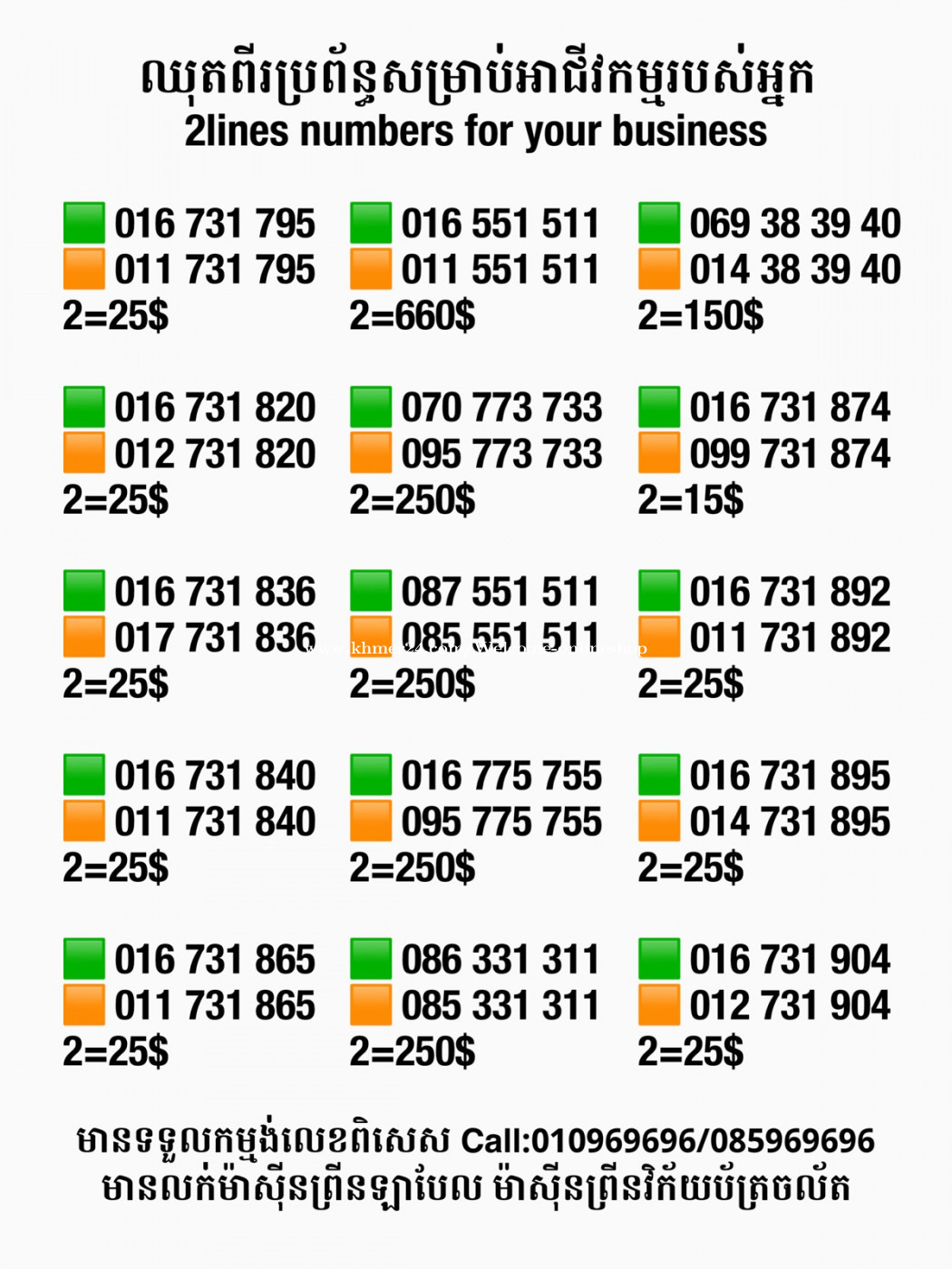 មានលក់លេខពិសេស មានទទួលកម្មង់លេខពិសេស មានលក់ម៉ាស៊ីនព្រីនឡាបែល មានលក់ម៉ាស៊ីនព្រីនវិក័យប័ត្រ មានលក់សម្ភារៈប្រើប្រាស់ក្នុងគ្រួសារ Smart Prime II 1=30$ Smart hero 1=40$ ទូរសព្ទថ្មីក្នុងប្រអប់ លក់ធូរៗរហូតអស់ពីស្តុក អាចប្រើជាឧបករណ៍សម្រាប់ស៊ែរ wifi បាន ទំនាក់ទំនង(ខ្មែរ | English | 中文):010969696 | 085969696 Telegram: https://t.me/W9696 Telegram group: https://t.me/konkonnada អាសយដ្ឋាន:ផ្ទះលេខ២៣ ផ្លូវបេតុងលេខ១ ភូមិទួលពង្រ សង្កាត់ចោមចៅ ខណ្ឌពោធិ៍សែនជ័យ រាជធានីភ្នំពេញ ទីតាំង https://goo.gl/maps/8moqW4iTHUfJEvWQ9 ដើម្បីស្វែងរកលេខអាជីវកម្មដែលលោកអ្នកពេញចិត្ត សូមចូលទៅកាន់:https://www.khmer24.com/Welcome-onlineshop