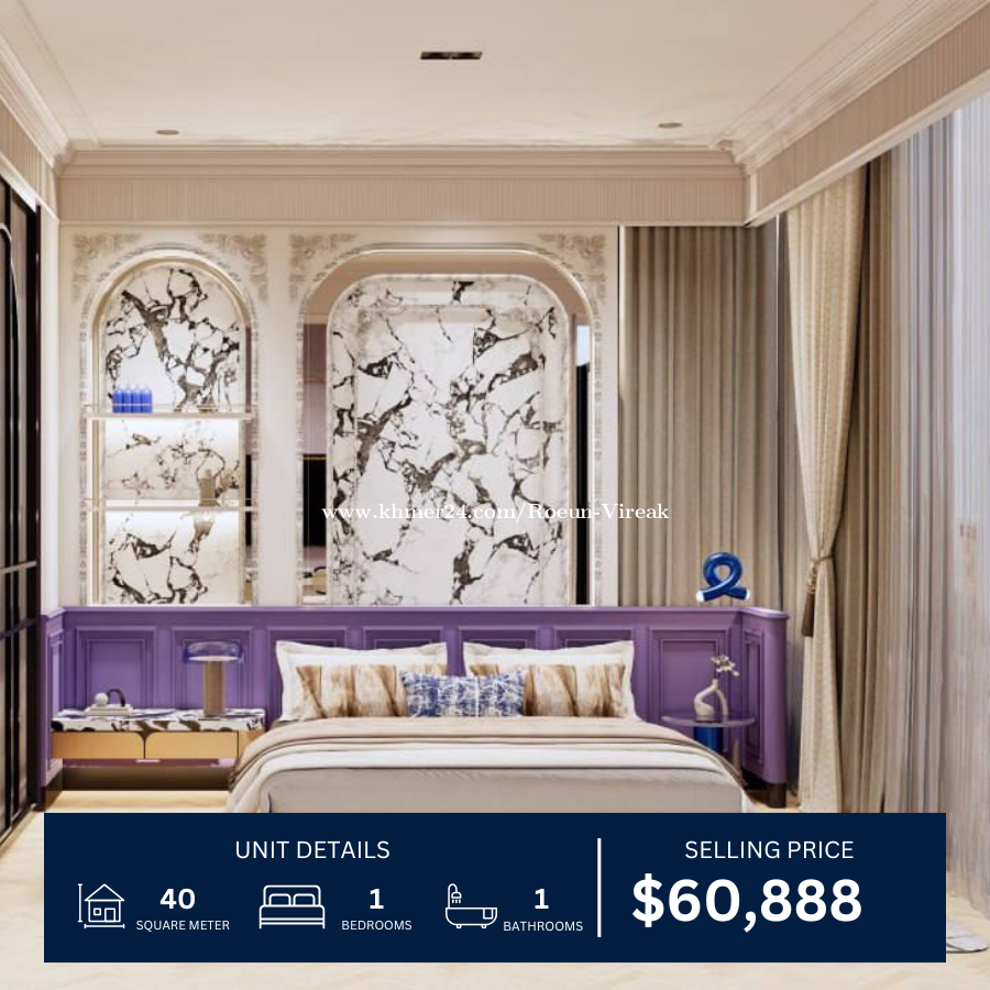 Time Square 7 – ទួលគោក | បន្ទប់គេង1 តម្លៃត្រឹម $60,888 ប៉ុណ្ណោះ! 📍 ទីតាំង៖ ទួលគោក, ភ្នំពេញ ជាន់ទី ៣២ |ទំហំ៖ ៤០ ម៉ែត្រការ៉េ 💰 តម្លៃពិសេស៖ $60,888 💵 ការបង់ប្រាក់មានភាពបត់បែន៖ • កក់មុន៖ $1,000 • ចុះកុងត្រា(SPA): ២០%=$11,177 • បង់រំលស់១%រយៈពេល៤០ខែគ្មានការប្រាក់=$609 •ចំនួនប្រាក់នៅសល់៖ បង់នៅពេលប្រគល់ផ្ទះ ឬ តាមរយៈការខ្ចីធនាគារ 📞 ទំនាក់ទំនងមកយើងខ្ញុំឥឡូវនេះ ស្វែងរកព័ត៌មានបន្ថែម៖https://t.me/TimeSquareCondoforSaleRent 📲 ០១២ ២៤២ ២៦៦ | ០១៥ ២៦២ ៣៥៦ Telegram :https://t.me/Seniorsaleandmarketing ——————————————- Time Square 7 – Toul Kork | 1 Bedroom Unit Only $60,888! 📍 Location: Toul Kork, Phnom Penh Floor: 32nd | Size: 40 sqm 💰 Special Price: $60,888 💵 Flexible Payment Plan: • Booking Fee: $1,000 • Sale Agreement (SPA): 20% = $11,177 • Monthly Installment: 1% for 40 months, interest-free = $609/month • Remaining Balance: Pay on handover or via bank loan 📞 Contact us now! Find more info:https://t.me/TimeSquareCondoforSaleRent 📲 012242xxxClick To Call | 015262xxxClick To Call Telegram https://t.me/Seniorsaleandmarketing