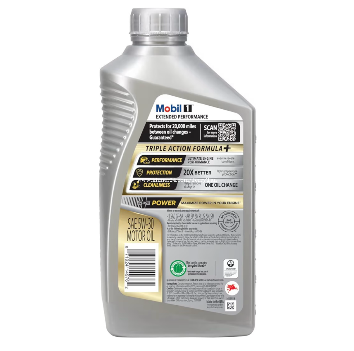 Mobil 1 Extended Performance ប្រេងម៉ាស៊ីនសំយោគពេញលេញ 5W-30 ជួយការពារផ្នែកសំខាន់ៗរបស់ម៉ាស៊ីនរហូតដល់ 20,000 ម៉ាយរវាងការផ្លាស់ប្តូរប្រេង * គ្រប់គ្រងអុកស៊ីតកម្មដើម្បីការពារការបំបែកប្រេង និងរក្សា viscosity ដ៏ល្អ។ ប្រើប្រាស់រូបមន្ត Triple Action+ របស់ Mobil 1 ដើម្បីបញ្ចូលគ្នានូវដំណើរការម៉ាស៊ីន ការការពារ និងភាពស្អាតស្អំជាមួយនឹងអត្ថប្រយោជន៍បន្ថែមនៃថាមពល។ បំពេញតាមស្តង់ដារ ILSAC GF-6 ដើម្បីជួយផ្តល់នូវការបញ្ឆេះមុនល្បឿនទាប (LSPI) និងការការពារការពាក់ខ្សែសង្វាក់ពេលវេលា ខណៈពេលដែលរក្សាម៉ាស៊ីនរបស់អ្នកឱ្យស្អាត និងជួយកែលម្អការសន្សំសំចៃប្រេងរបស់អ្នក។ ជួយពន្យារអាយុម៉ាស៊ីនដោយធ្វើការដើម្បីការពារការបំផ្លាញប្រាក់បញ្ញើ និងកំណកកំបោរ ផ្តល់នូវការការពារកំដៅម៉ាស៊ីនខាងក្នុងដ៏ល្អ (រហូតដល់ 500 ដឺក្រេ F) និងការការពារសីតុណ្ហភាពទាប (ដល់ -40 ដឺក្រេ F) Telegram https://t.me/vi_bol095