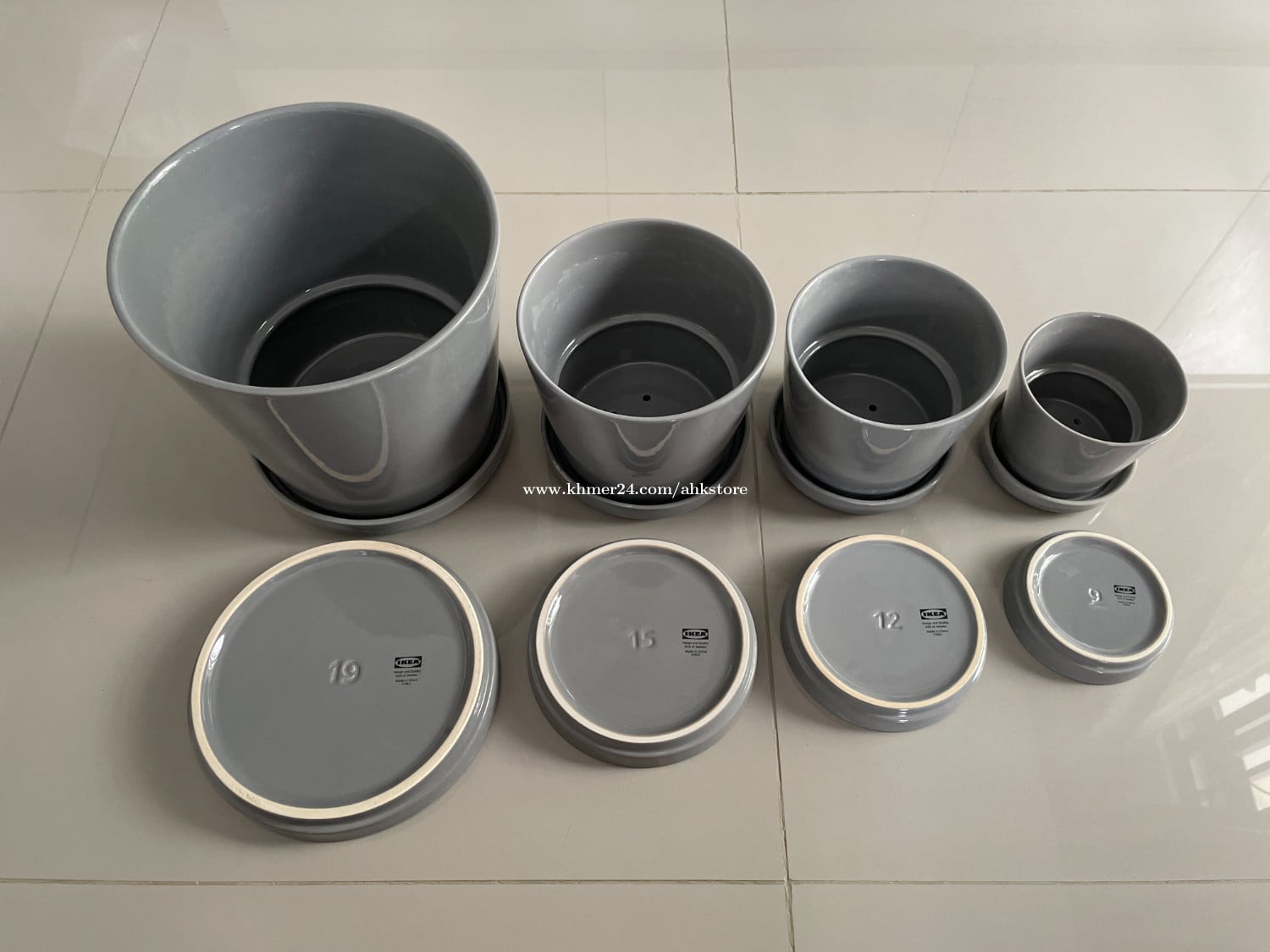 ផើងផ្កា IKEA CITRUSFRUKT ប្រេន៖ IKEA ស្ថានភាព៖ ប្រើរួច ---------- ទំហំ៖ 19cm ចំនួន៖ 2pcs តម្លៃដើម៖ 16$/1pc => តម្លៃដាក់លក់៖ 8$/1pc | 15$/2pcs ---------- ទំហំ៖ 15cm ចំនួន៖ 2pcs តម្លៃដើម៖ 9$/1pc => តម្លៃដាក់លក់៖ 4.5$/1pc | 8$/2pcs ---------- ទំហំ៖ 12cm ចំនួន៖ 6pcs តម្លៃដើម៖ 6$/1pc => តម្លៃដាក់លក់៖ 3$/1pc | 16$/6pcs ---------- ទំហំ៖ 9cm ចំនួន៖ 6pcs តម្លៃដើម៖ 4.5$/1pc => តម្លៃដាក់លក់៖ 2$/1pc | 10$/6pcs
