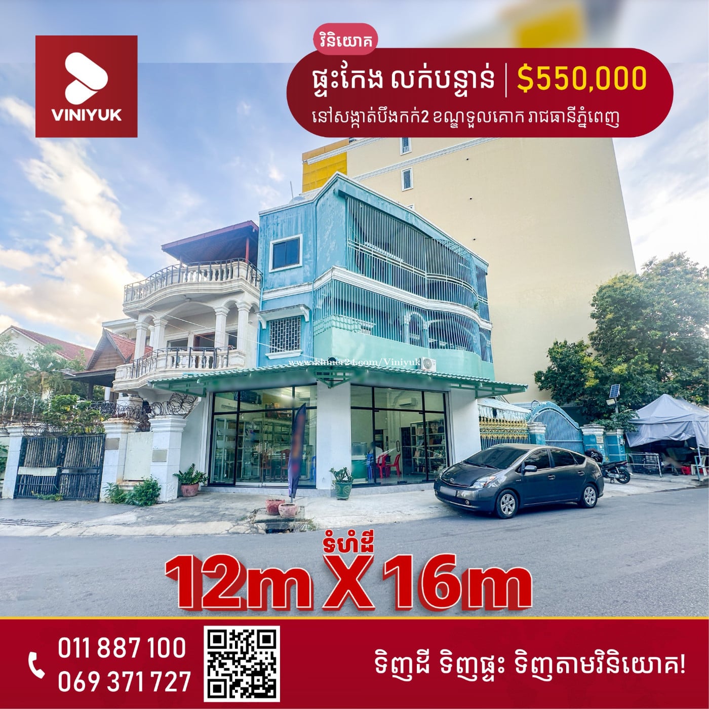 🏡ផ្ទះកែង លក់បន្ទាន់!! 📍ទីតាំង ៖ នៅសង្កាត់បឹងកក់ទី2 ខណ្ឌទួលគោក រាជធានីភ្នំពេញ - តម្លៃលក់ $550,000 - ទំហំដី : 12m x 16m (LMAP: 188m²) - ទំហំផ្ទះ : 6m x 9m - មានបន្ទប់ 9 , បន្ទប់ទឹក 5 - ប្លង់រឹង - លេខអាជ្ញាប័ណ្ណ : E-22-404