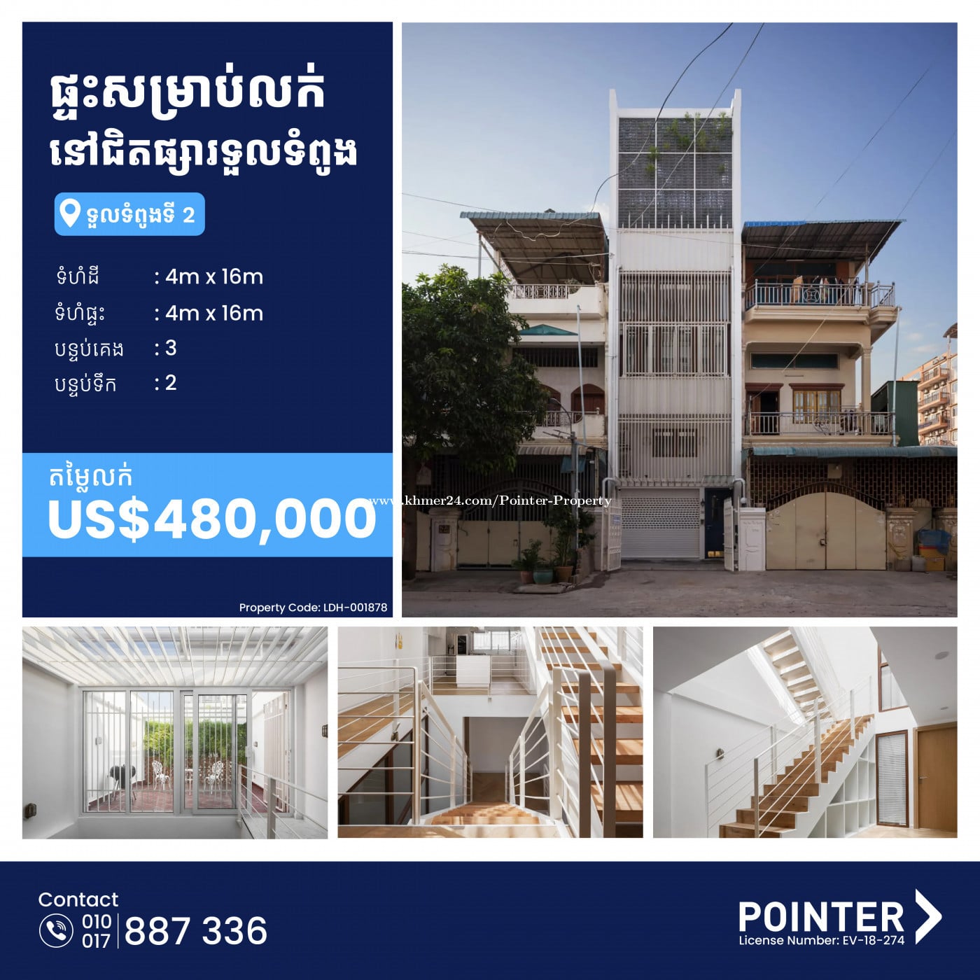 តម្លៃលក់៖ $480,000 - ទំហំផ្ទះ : 4m x 16m - ទំហំដី : 4m x 16m - បន្ទប់គេង 3 - បន្ទប់ទឹក 2 ☎️ លេខទំនាក់ទំនង: Smart010887xxxClick To Call / Smart070887xxxClick To Call 📲Telegram: t.me/Pointerproperties ————————————————— ដៃគូអចលនទ្រព្យដ៏ទុកចិត្តរបស់អ្នក Your Trusted Real Estate Partner 🌐 https://pointerasia.com/ 💬 Telegram Channel: https://t.me/pointerproperty 🔗Link to property: https://pointer.asia/8nRYs