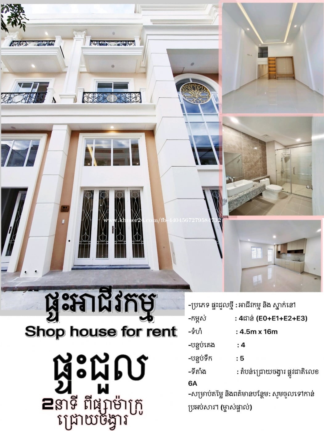 -ប្រភេទ ផ្ទះជួលថ្មី : អាជីវកម្ម និង ស្នាក់នៅ -កម្ពស់ : 4ជាន់ (E0+E1+E2+E3) -ទំហំ : 4.5m x 16m -បន្ទប់គេង : 4 -បន្ទប់ទឹក : 5 -ទីតាំង : តំបន់ជ្រោយចង្វារ ផ្លូវជាតិលេខ 6A -តម្លៃ : $700 (អាចចរចារបាន ម្ចាស់ផ្ទាល់) -Telegram : 015989xxxClick To Call