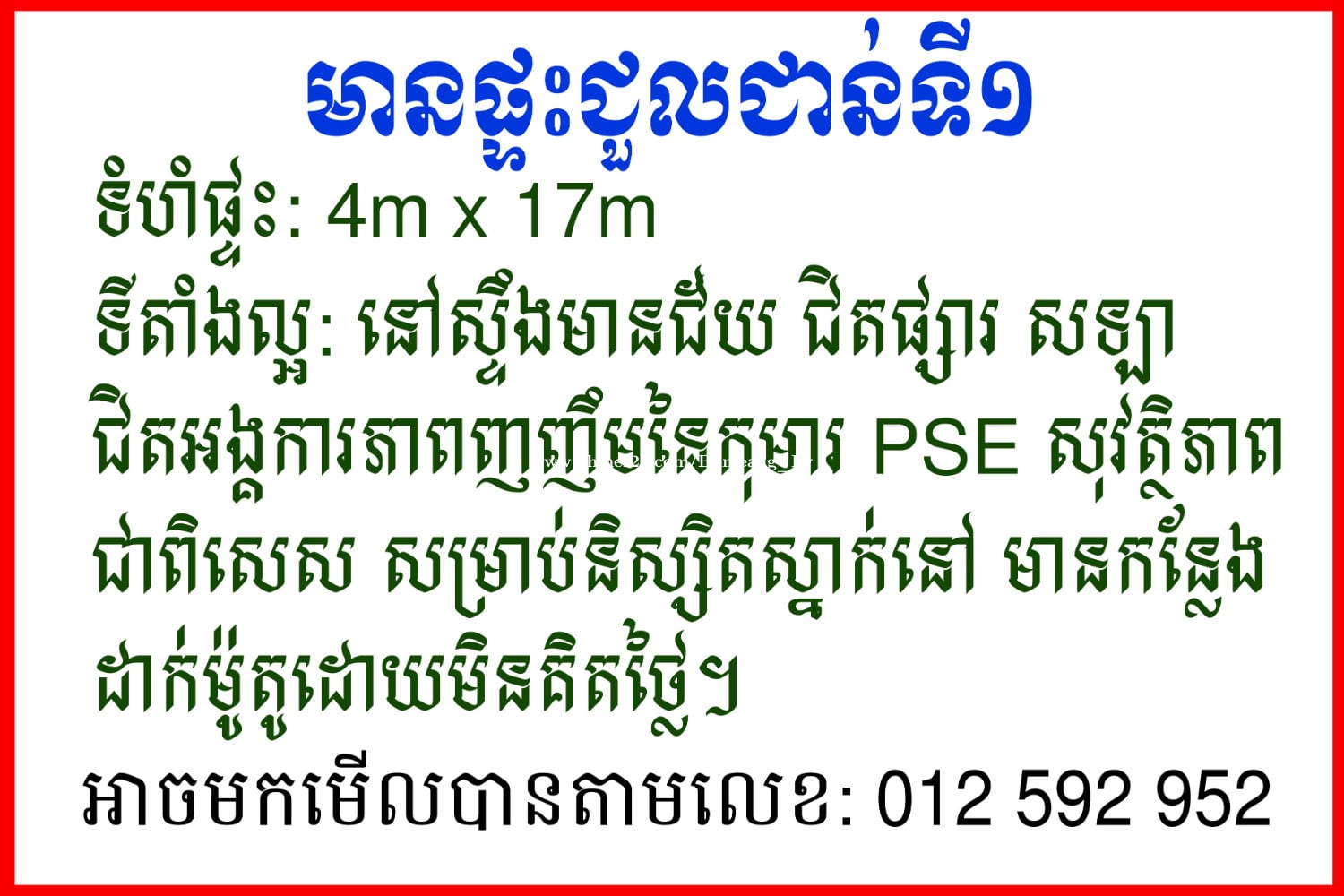 មានផ្ទះជួលជាន់ទី១ ទីតាំងល្អ មានសុវត្ថិភាព ជាពិសេស សម្រាប់និស្សិតស្នាក់នៅ មានកន្លែងដាក់ម៉ូតូដោយមិនគិតថ្លៃ។ ទំហំផ្ទះ 4m x 17m មានបន្ទប់ទទួលភ្ញៀវ បន្ទប់គេង ផ្ទះបាយ បន្ទប់ទឹក និងបង្គន់។ ទីតាំងៈ នៅស្ទឹងមានជ័យ ជិតផ្សារ សឡា ជិតអង្គការភាពញញឹមនៃកុមារ ឬហៅកាត់ថា អង្គារ PSE សម្រាប់ព័ត៌មានបន្ថែម សូមទាក់ទងតាមលេខ 012592xxxClick To Call / 081619xxxClick To Call