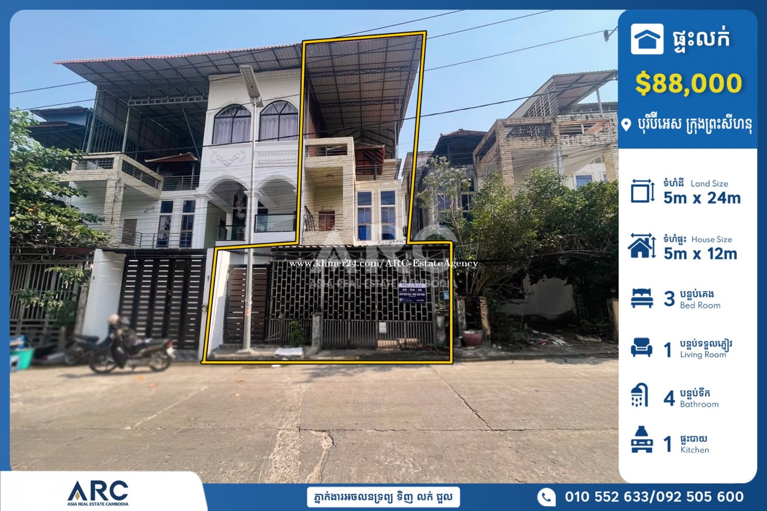 🏠#ផ្ទះលក់បន្ទាន់ ក្នុងបុរីប៊ីអេសអូរ៥ ក្រុងព្រះសីហនុ * តម្លៃ : 88,000$ ចរចា * ទំហំផ្ទះ : 5m x 12m * ទំហំដី : 5m x 24m * មានបន្ទប់គេង 3 បន្ទប់ទឹក 4 📍ទីតាំង សង្កាត់លេខ4 ក្រុងព្រះសីហនុ ខេត្តព្រះសីហនុ សម្រាប់ពត៏មានលម្អិតសូមទំនាក់ទំនងមកក្រុមការងារ 010552xxxClick To Call/ 092505xxxClick To Call Chat to Telegram @THY_Den Channel Telegram https://t.me/ARC_Sihanoukville 👉 អាជ្ញាប័ណ្ណ៖ EV-08-069