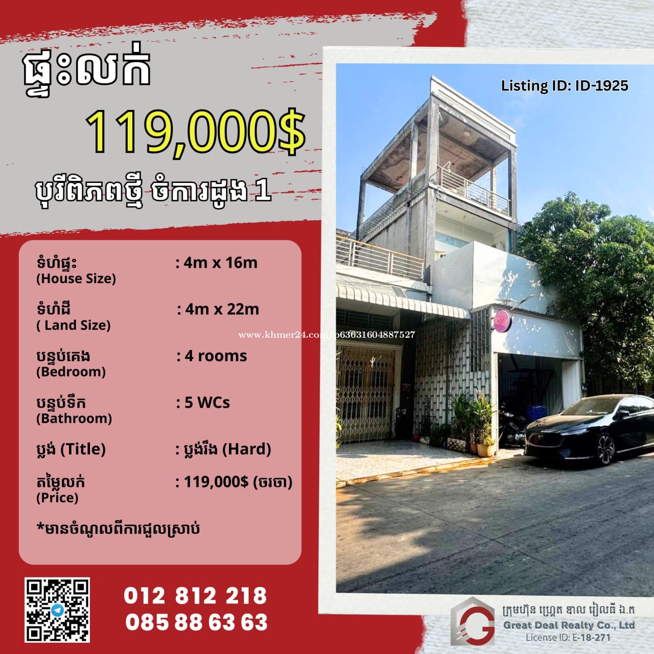 ផ្ទះលក់ នៅបុរីពិភពថ្មី ចំការដូង១ តម្លៃ: $119,000 (ចរចាប្លង់រឹង) ទំហំផ្ទះ: 4m x 16m ទំហំដី: 4m x 22m ផ្ទះមាន៤ បន្ទប់គេង និង ៥បន្ទប់ទឹក ប្លង់រឹង មានចំណូលស្រាប់ ☎️សម្រាប់ព័ត៌មានបន្ថែម៖ 012812xxxClick To Call/ 015812xxxClick To Call/ 087812xxxClick To Call