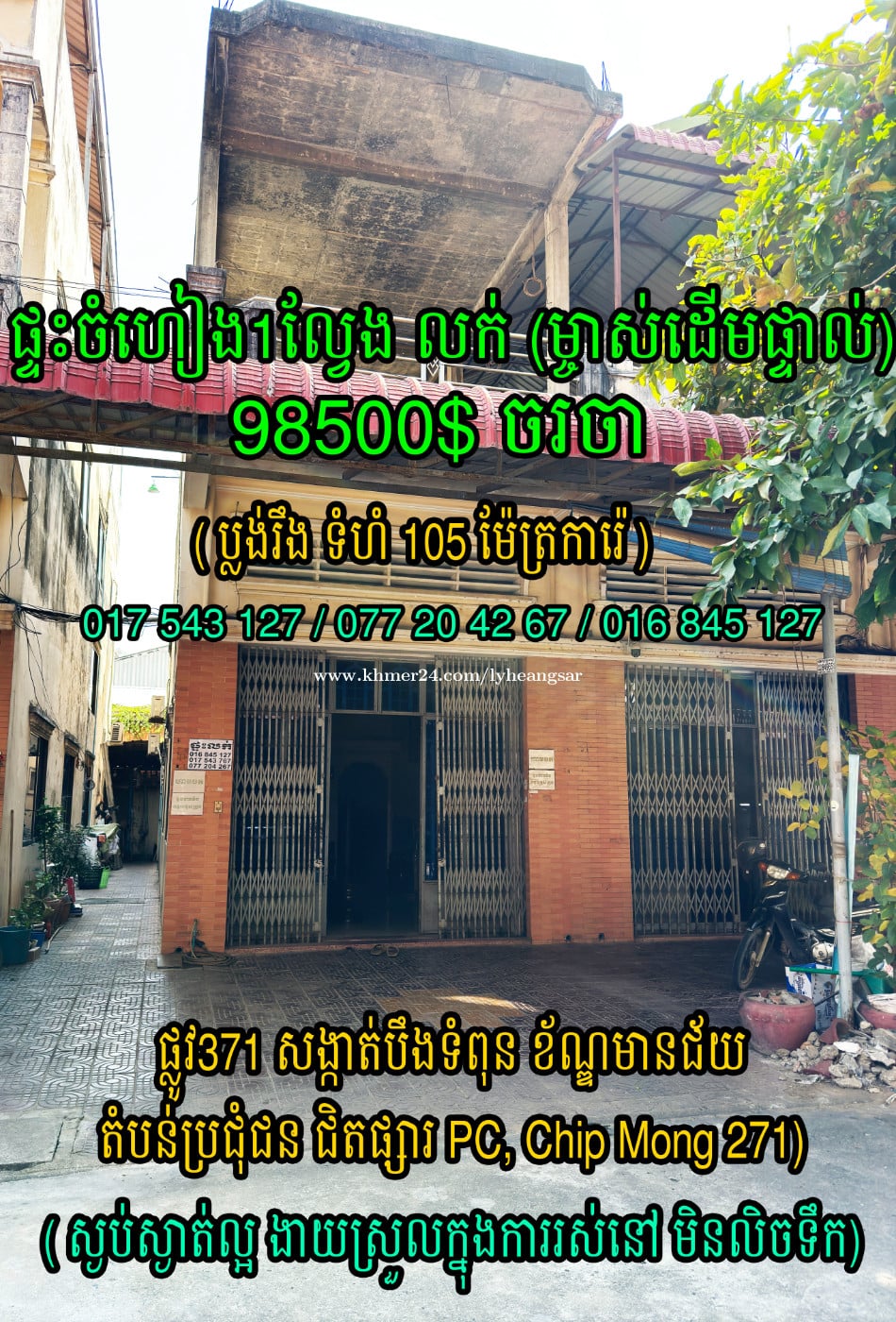 ផ្ទះល្វែងចំហៀងលក់ (ម្ចាស់ដើមផ្ទាល់) ប្លង់រឹង ផ្លូវ371 ជិតផ្សារPC និង Chipmong271 -សាច់ផ្ទះ 4.2m x 16m -មានប្លង់សេ1សន្លឹកចាក់រួច សរុបទាំងអស់មានប្លង់សេ 2 សន្លឹក -សល់មុខ 5m, សល់ក្រោយ 3m, ចំហៀង 1m -កំពស់ពីដី ទៅប្លង់សេទី1 = 4.8m -ទំហំក្នុងប្លង់រឹង 105 m2 -បន្ទប់គេង 3 បន្ទប់ទឹក2 និងផ្ទះបាយ1 -តម្លៃ 98500$ (ចរចាបាន) សំណង់ស្អាត ពេញខ្នាតមិនលិចទឹក រួមជាមួយនឹងទីតាំងចំកណ្ដាលក្រុង+ទីប្រជុំជន ជិតផ្សារ PC និង Chip Mong 271 -ទីតាំងផ្ទះ ផ្លូវ371 សង្កាត់បឹងទំពុន ខ័ណ្ឌមានជ័យ ក្រុងភ្នំពេញ (200m ពីផ្សារPC និង 2Km ពីផ្សារ Chip Mong 271) -ទូរស័ព្ទ 016845xxxClick To Call / 017543xxxClick To Call 016830xxxClick To Call / 077204xxxClick To Call -ទីតាំងក្នុងMap: https://maps.app.goo.gl/ruix61VrbDfs3Ain8?g_st=com.google.maps.preview.copy