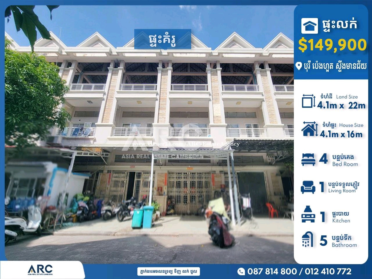 🏘️ ផ្ទះល្វែង(Flat) សម្រាប់លក់បន្ទាន់នៅបុរី ប៉េងហួត ស្ទឹងមានជ័យ *តម្លៃ: 149,900$(ចរចាជាមួយម្ចាស់ផ្ទះផ្ទាល់) *ទំហំផ្ទះ Size House: 4.1m x 16m *ទំហំដី Size Land: 4.1m x 22m *បន្ទប់គេង Bedroom: 4 *បន្ទប់ទឹក Bathroom: 5 👉ផ្ទេរកម្មសិទ្ធិ:(ប្លង់រឹងជូន) 👉ផ្ទះថ្មីស្អាត ៣នាទីពីផ្សារទំនើបស្ទឹងមានជ័យថ្មី មានសន្តិសុខ២៤ម៉ោង មានផាសុខភាព សុវត្ថិភាព..... 📍 នៅសង្កាត់ស្ទឹងមានជ័យ ខណ្ឌមានជ័យ រាជធានីភ្នំពេញ Tel: 087814xxxClick To Call / 092821xxxClick To Call / 067477xxxClick To Call Telegram http://t.me/@Vebol087 Channel Telegram https://t.me/ARCDangkorVebol Channel telegram: https://t.me/AsiaRealEstateCambodia #ផ្ទះលក់បន្ទាន់ខ្លាំង #villaforsale #KhanDangkao #khanmeanchey 👉អាជ្ញាប័ណ្ណ: EV-08-069