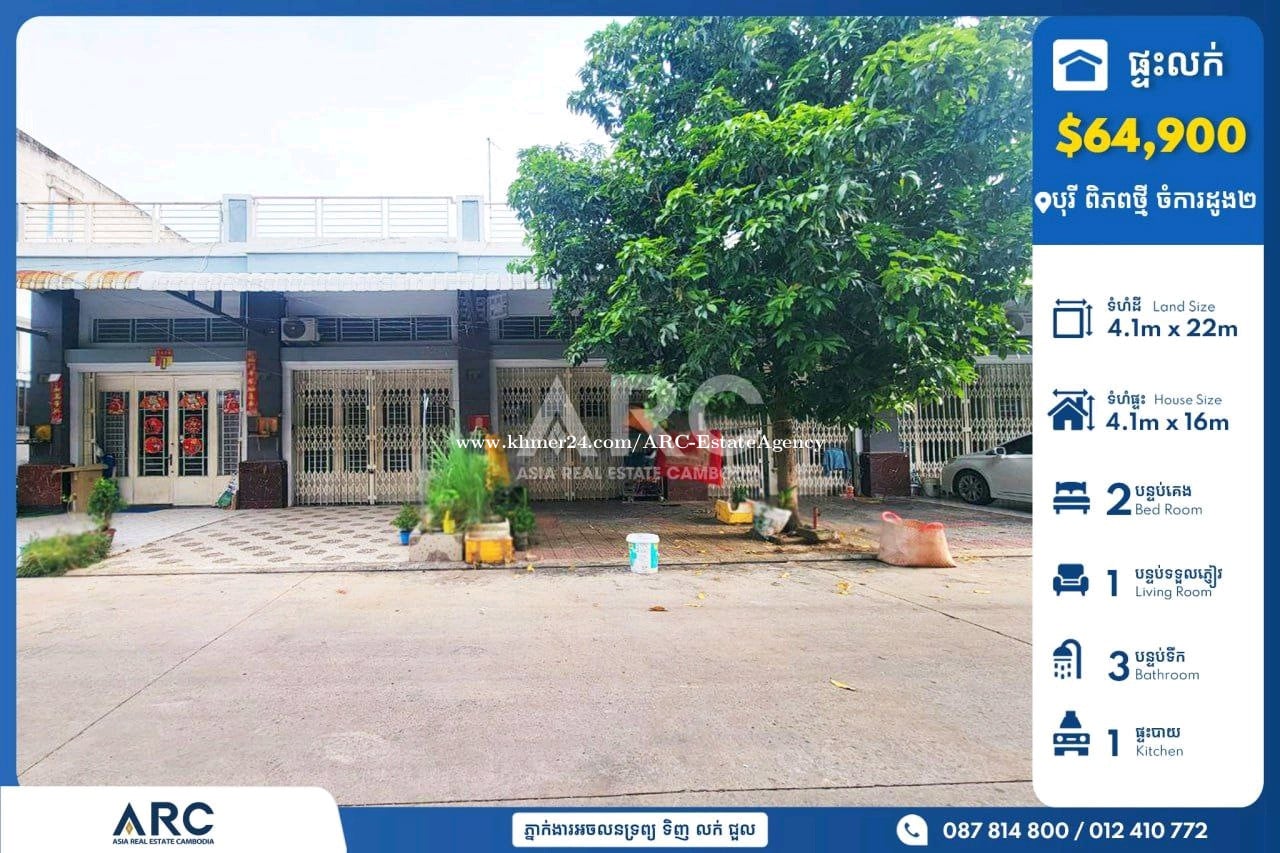 🏘️ ផ្ទះល្វែង(Flat) សម្រាប់លក់បន្ទាន់នៅបុរី ពិភពថ្មី(ចំការដូង២) *តម្លៃ: 64,900$(ចរចាជាមួយម្ចាស់ផ្ទាល់) *ទំហំផ្ទះ Size House: 4.1m x 16m *ទំហំដី Size Land: 4.1m x 22m *បន្ទប់គេង Bedroom: 2 *បន្ទប់ទឹក Bathroom: 3 👉ផ្ទេរកម្មសិទ្ធិ:(ប្លង់រឹងជូន) 👉ផ្ទះថ្មីស្អាត មានផ្សារ សាលរៀន មានសន្តិសុខ២៤ម៉ោង មានផាសុខភាព សុវត្ថិភាព..... 📍 នៅសង្កាត់ព្រៃស ខណ្ឌដង្កោ រាជធានីភ្នំពេញ Tel: 087814xxxClick To Call / 092821xxxClick To Call / 067477xxxClick To Call Telegram http://t.me/@Vebol087 Channel Telegram https://t.me/ARCDangkorVebol Channel telegram: https://t.me/AsiaRealEstateCambodia #ផ្ទះលក់បន្ទាន់ខ្លាំង #villaforsale #KhanDangkao #khanmeanchey 👉អាជ្ញាប័ណ្ណ: EV-08-069