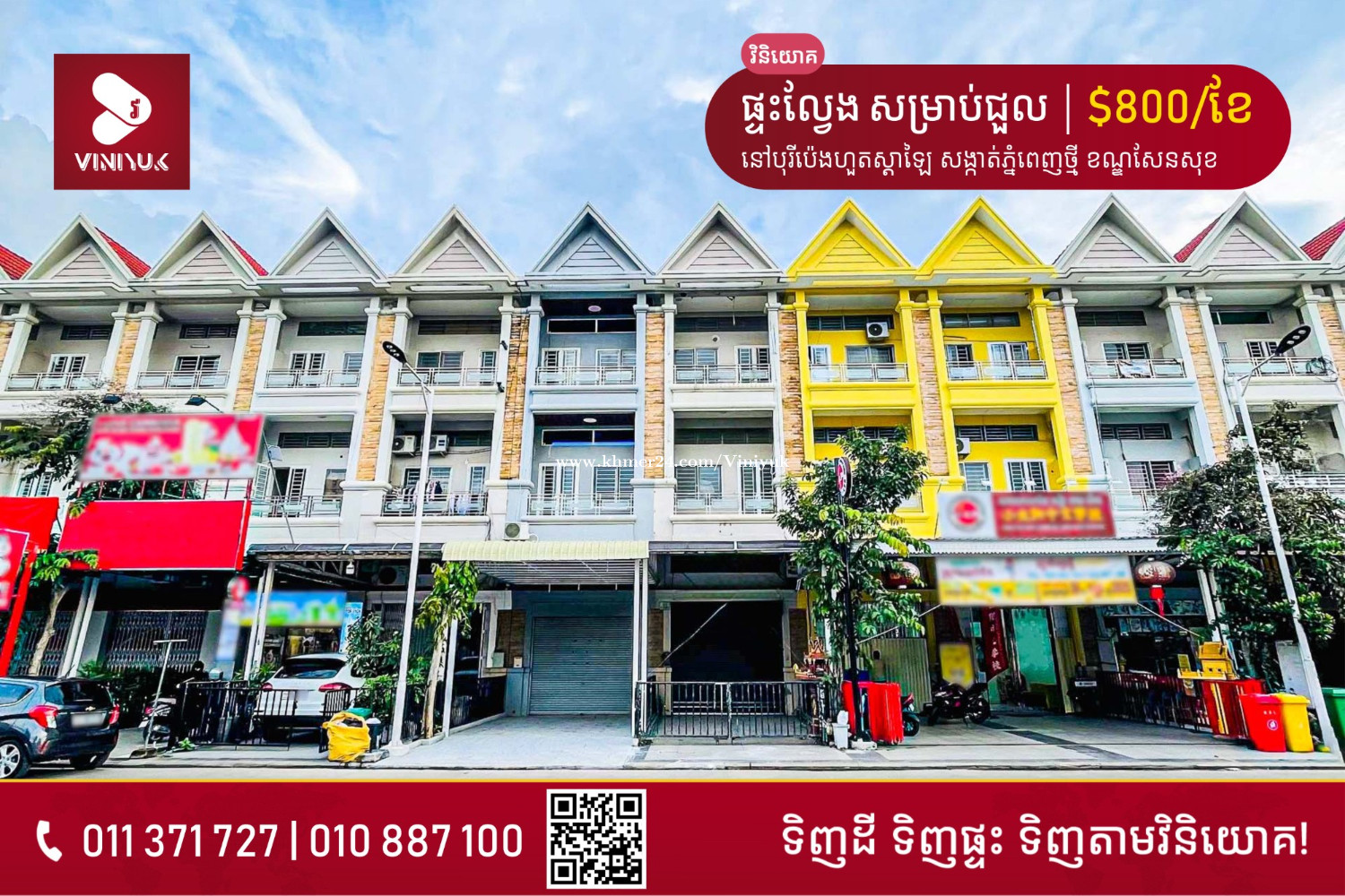 🏡ផ្ទះល្វែង សម្រាប់ជួល!! 📍ទីតាំង ៖ នៅបុរីប៉េងហួតស្តាឡៃ សង្កាត់ភ្នំពេញថ្មី ខណ្ឌសែនសុខ រាជធានីភ្នំពេញ - តម្លៃលក់ : $800/ខែ ចរចា - ទំហំផ្ទះ : 4.2m x 16m - មានបន្ទប់គេង 4 , បន្ទប់ទឹក 5 - ផ្ទះមានសភាពនៅស្អាតល្អ - ម៉ាស៊ីនត្រជាក់3 គ្រឿង - លេខអាជ្ញាប័ណ្ណ : E-22-404