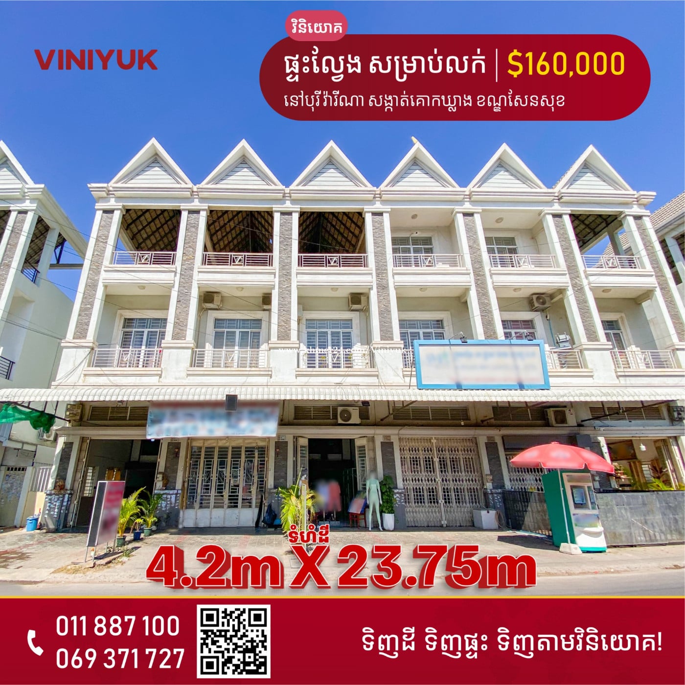 🏡ផ្ទះល្វែង សម្រាប់លក់!! 📍ទីតាំង ៖ នៅបុរីវ៉ារីណា សង្កាត់គោកឃ្លាង ខណ្ឌសែនសុខ រាជធានីភ្នំពេញ - តម្លៃលក់: $160,000 ចរចា - ទំហំដី: 4.2m x23.75 m - ទំហំផ្ទះ: 4.2m x 16m - បន្ទប់គេង4, បន្ទប់ទឹក5 - មានសម្ភារៈ ម៉ាស៊ីនត្រជាក់3 - ទិស ត្បួង - ប្លង់ រឹង - លេខអាជ្ញាប័ណ្ណ : E-22-404
