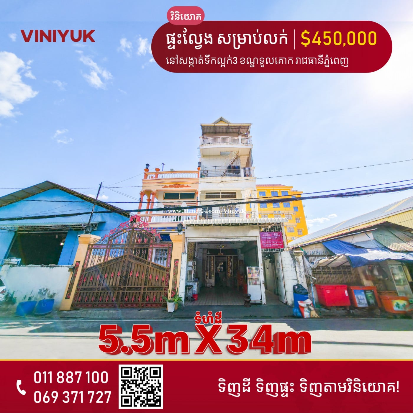 🏡ផ្ទះល្វែង សម្រាប់លក់!! 📍ទីតាំង ៖ នៅសង្កាត់ទឹកល្អក់3 ខណ្ឌទួលគោក រាជធានីភ្នំពេញ រាជធានីភ្នំពេញ - តម្លៃលក់: $450,000 ចរចា - ទំហំដី : 5.5m x 34m (សល់ដីចំហៀង1m, សល់ក្រោយ 10m, សល់មុខ6m) - ទំហំក្នុងប្លង់ 191m² - ទំហំផ្ទះ : 4.5m x 18m - មានបន្ទប់17 , បន្ទប់ទឹក 17 - ទិសជើង - កាត់ប្លង់រឹង - លេខអាជ្ញាប័ណ្ណ : E-22-404