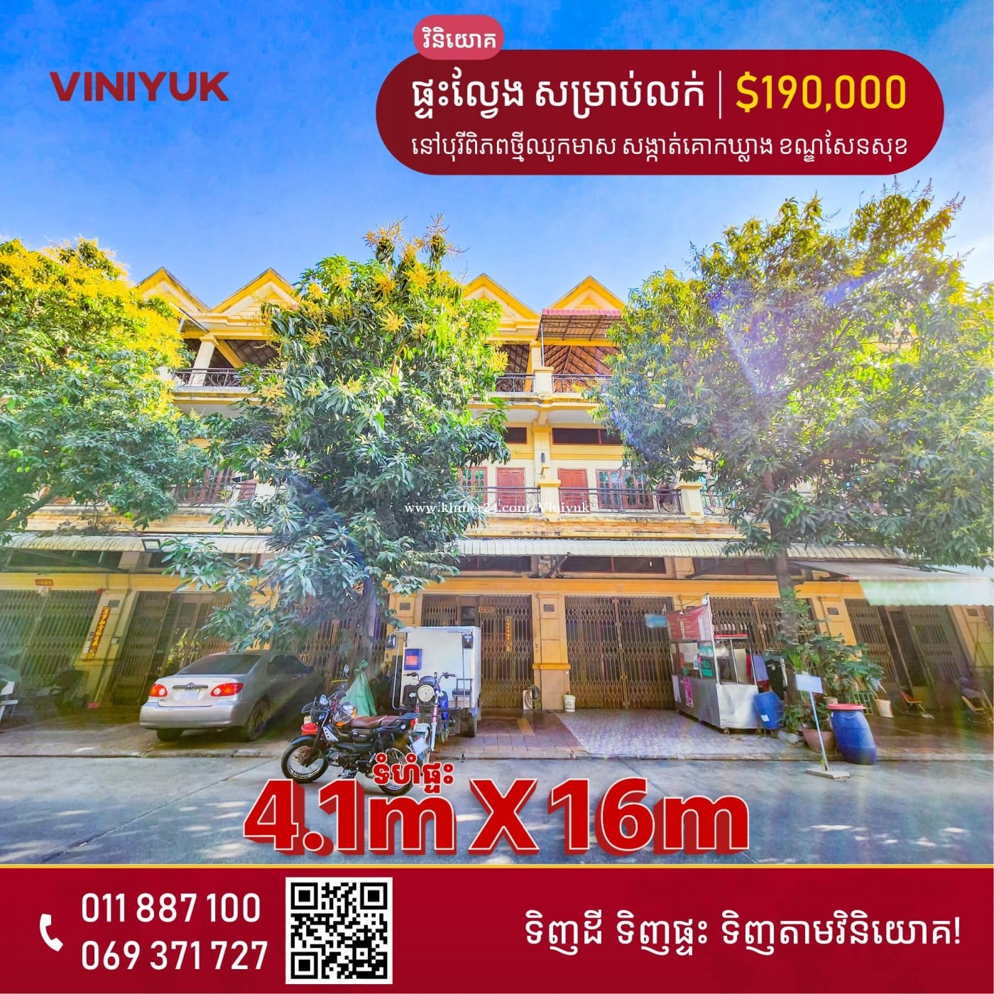 🏡ផ្ទះល្វែង សម្រាប់លក់! 📍ទីតាំង ៖ នៅបុរីពិភពថ្មីឈូកមាស សង្កាត់គោកឃ្លាង ខណ្ឌសែនសុខ រាជធានីភ្នំពេញ - តម្លៃលក់ : $190,000 ចរចារ - ទំហំដី: 4.1m x 22m - ទំហំផ្ទះ : 4.1m x 16m - បន្ទប់គេង 4 បន្ទប់ទឹក 5 ,សល់ក្រោយ 1,2m សល់មុខផ្ទះ 4,5m - ទីតាំងសក្តានុពល អាចរកស៊ីបាន , លក់អនឡាញ ,លក់ដូរ ,បើកសាឡន.... - លេខអាជ្ញាប័ណ្ណ : E-22-404