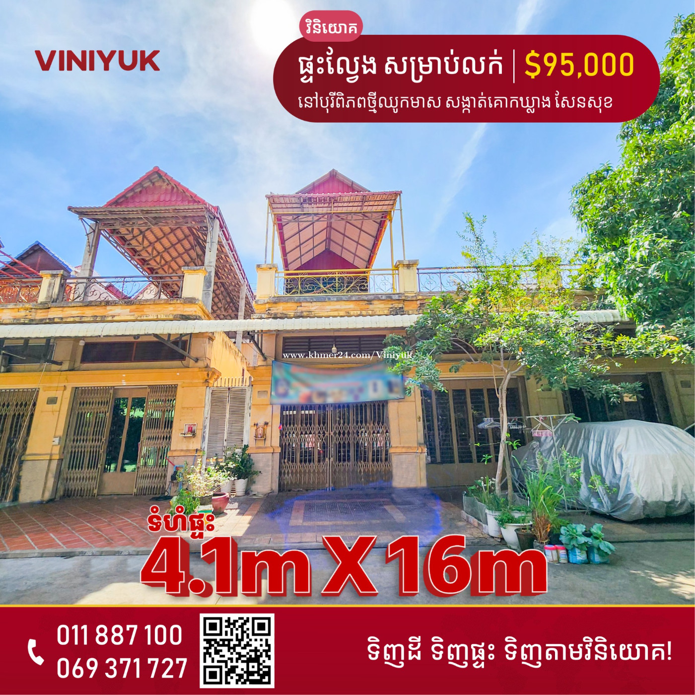 🏡ផ្ទះល្វែង សល់ចំហៀង សម្រាប់លក់!! 📍ទីតាំង ៖ នៅបុរីពិភពថ្មីឈូកមាស សង្កាត់ក្រាំងធ្នង់ ខណ្ឌសែនសុខ រាជធានីភ្នំពេញ - តម្លៃលក់ : $95,000 ចរចា - ទំហំផ្ទះ : 4.1m x 16m ,សល់ចំហៀង 1.2m - បន្ទប់គេង 2 បន្ទប់ទឹក 3 - សល់ដីចំហៀង 1m - ប្លង់ រឹង - ទីតាំងសក្តានុពល អាចរកស៊ីបាន , លក់អនឡាញ ,លក់ដូរ ,បើកសាឡន.... - លេខអាជ្ញាប័ណ្ណ : E-22-404