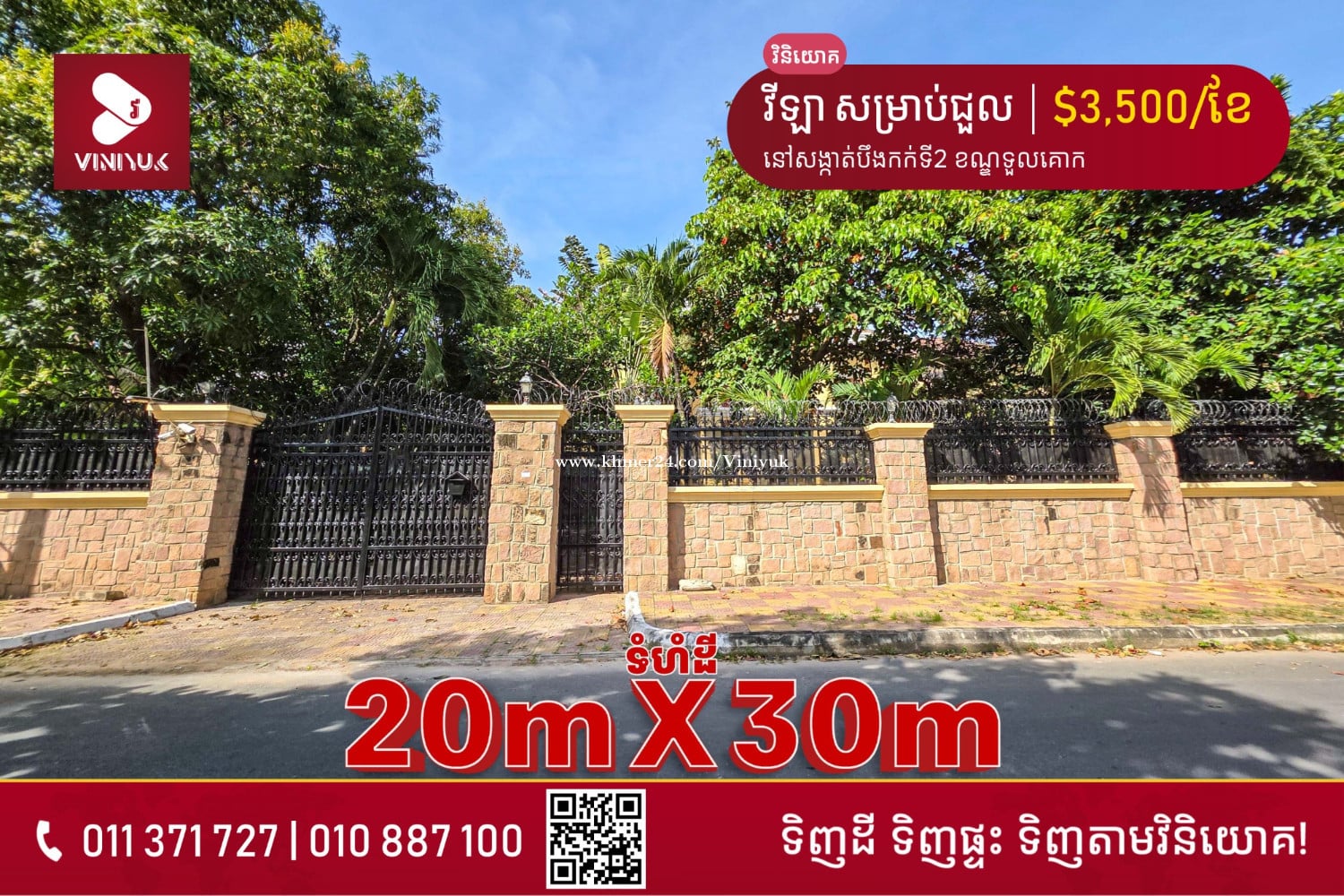 🏡ផ្ទះវីឡា សម្រាប់ជួល!! 📍ទីតាំង ៖ : នៅសង្កាត់បឹងកក់ទី2 ខណ្ឌទួលគោក រាជធានីភ្នំពេញ - តម្លៃជួល: $3,500/ខែ ចរចា - ទំហំដី : 20m x 30m - ទំហំផ្ទះ : 17m x 18m - បន្ទប់គេង 6 , បន្ទប់ទឹក 7 - បន្ទប់ទទួលភ្ញៀវ 1 , ចង្ក្រានបាយ 1 - ចំណតឡានធំទូលាយ - លេខអាជ្ញាប័ណ្ណ : E-22-404