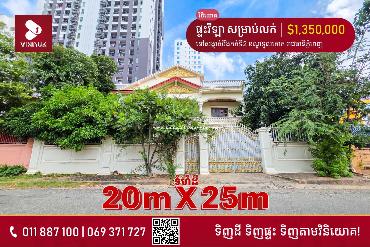 🏡ផ្ទះវីឡា សម្រាប់លក់!! 📍ទីតាំង ៖ នៅសង្កាត់បឹងកក់ទី2 ខណ្ឌទួលគោក រាជធានីភ្នំពេញ - តម្លៃ : $1,350,000 ចរចា - ទំហំដី : 20m x 25m - ទំហំផ្ទះ : 16m x 15m - មានបន្ទប់ 7 , បន្ទប់ទឹក 8 - ប្លង់រឹង - លេខអាជ្ញាប័ណ្ណ : E-22-404