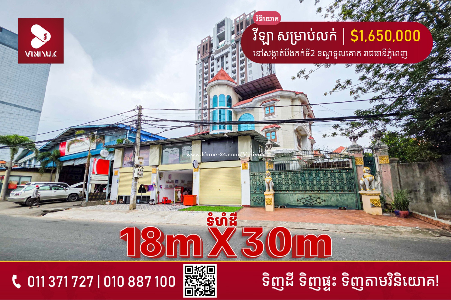 🏡ផ្ទះវីឡា សម្រាប់លក់!! 📍ទីតាំង ៖ នៅសង្កាត់បឹងកក់ទី2 ខណ្ឌទួលគោក រាជធានីភ្នំពេញ - តម្លៃលក់ : $1,650,000 ចរចា - ទំហំដី : 18m x 30m - បន្ទប់គេង 4 , បន្ទប់ទឹក 4 - ប្លង់រឹង - លេខអាជ្ញាប័ណ្ណ : E-22-404