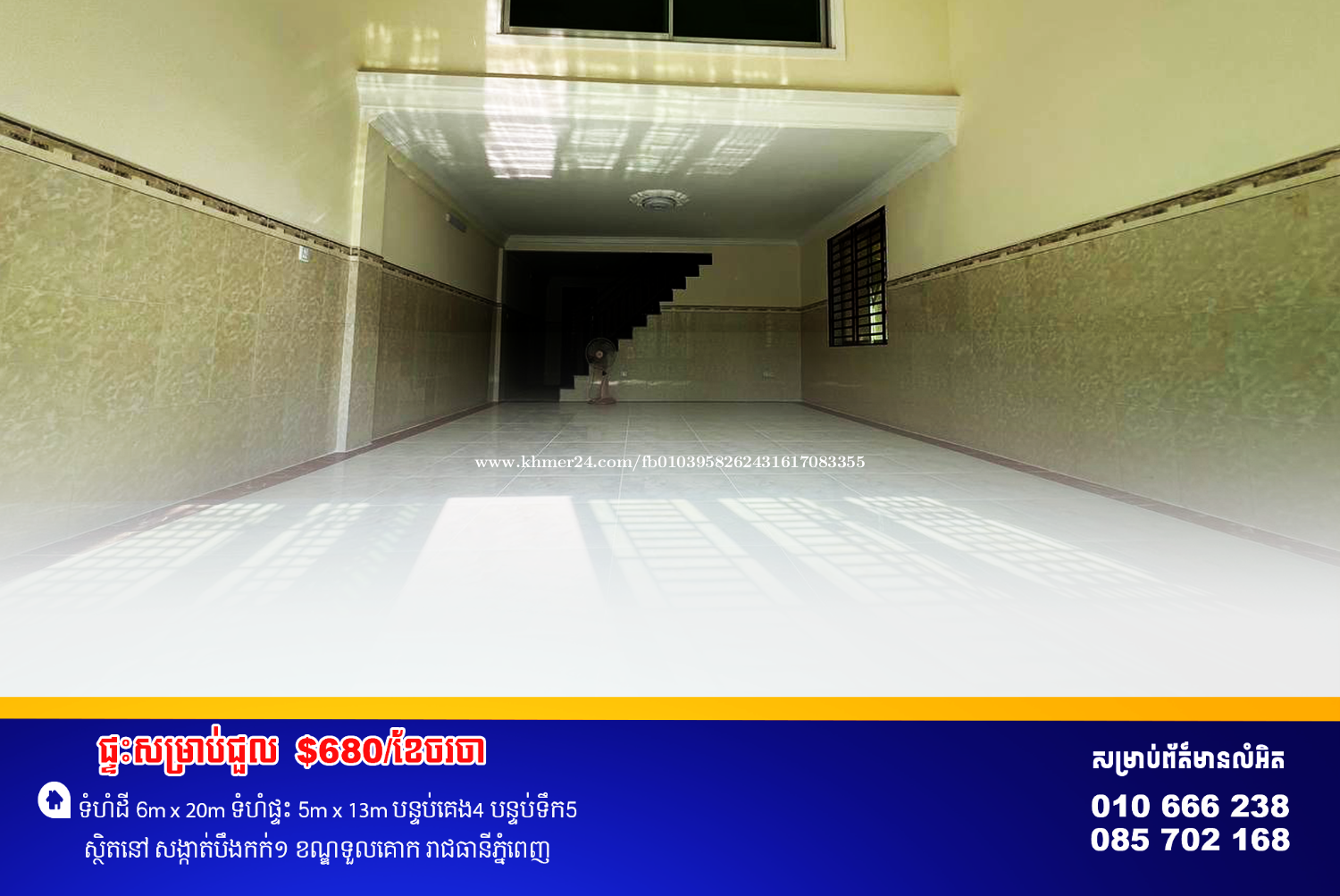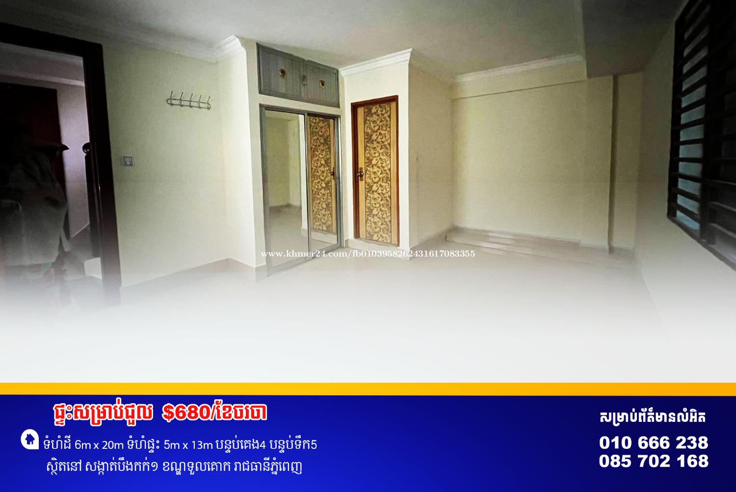 ផ្ទះសល់ដីចំហៀងសម្រាប់ជួល ស្ថិតនៅម្តុំរង្វង់ម៉ូលកាំកូស៊ីធី ល្អសម្រាប់ស្នាក់នៅ នឹងបើកជាការិយាល័យបាន 📍ទីតាំងស្ថិននៅ សង្កាត់ បឹងកក់ទី១ ខណ្ឌទួលគោក ភ្នំពេញ ************************** តម្លៃជួលRent Price $680/month ◈━━━━━━━━━━━━◈ កុងត្រាជួលចាប់ពី1-3ឆ្នាំ កក់2ខែបង់1ខែ Contract : 1-3Years Deposit2 Payment 1 ◈━━━━━━━━━━━━◈ 📍សូមចូលទៅកាន់𝗧𝗲𝗹𝗲𝗴𝗿𝗮𝗺 𝗖𝗵𝗮𝗻𝗻𝗲𝗹ពេលនេះ ដើម្បីស្វែងរកអចលនទ្រព្យពិសេសផ្សេងទៀត៖ 🔗 𝐓𝐞𝐥𝐞. 𝐂𝐡𝐚𝐧𝐧𝐞𝐥:𝗵𝘁𝘁𝗽𝘀://𝘁.𝗺𝗲/𝗦𝗼𝗸𝗵𝗮𝗶𝗥𝗲𝗮𝗹𝘁𝘆 ☎️ 𝗧𝗲𝗹𝗲𝗴𝗿𝗮𝗺:𝟬𝟭𝟬 𝟲𝟲𝟲 𝟮𝟯𝟴 ☎️ 𝗧𝗲𝗹𝗲𝗴𝗿𝗮𝗺:𝟬𝟴𝟱 𝟳𝟬𝟮 𝟭𝟲𝟴