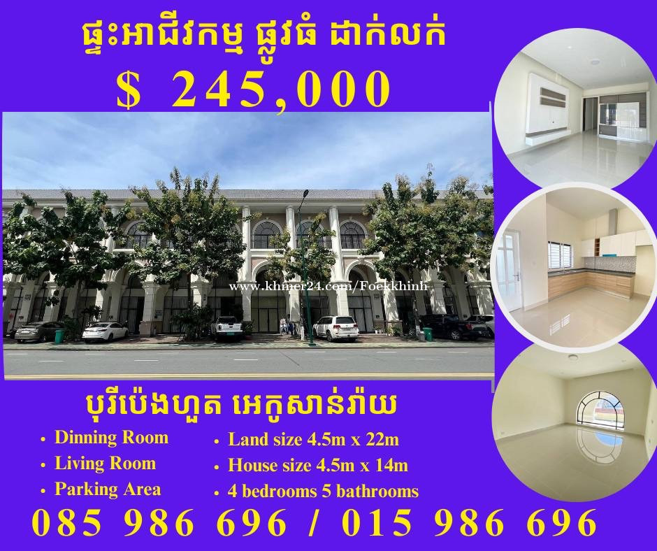 + ផ្ទះអាជីវកម្ម លើផ្លូវធំ លក់បន្ទាន់ + ទីតាំងបុរីប៉េងហួតបឹងស្នោរ គំរោងសាន់រ៉ាយ + តម្លៃ/Price $ 245,000 + ផ្ទេរឈ្មោះត្រឹមបុរី / Borey title + ទំហំដី/ Land size 4.5m x 22m + ទំហំផ្ទះ/ House size 4.5m x 14m + បន្ទប់គេង/ Bedroom 4 + បន្ទប់ទឹក/ Bathroom 5 + បន្ទប់ទទួលភ្ញៀវ/ Living room 1 + ផ្ទះបាយ/ Kitchen 1 + ទំនាក់ទំនង / Contact / Telegram: ☎️ Cellcard: 085986xxxClick To Call ☎️ Smart: 015986xxxClick To Call