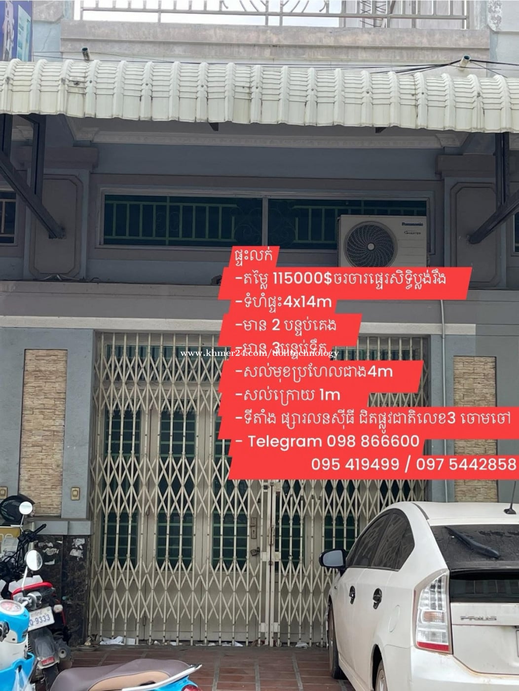 ផ្ទះអាជីវកម្មលក់បន្ទាន់ -តម្លៃ 115000$ចរចារផ្ទេរសិទ្ធិប្លង់រឹង -ទំហំផ្ទះ4x14m -មាន 2 បន្ទប់គេង -មាន 3បន្ទប់ទឹក -សល់មុខប្រហែលជាង4m -សល់ក្រោយ 1m -ទីតាំង ផ្សារលនសុីធី ជិតផ្លូវជាតិលេខ3 ចោមចៅ -Tel:098866xxxClick To Call / 095419xxxClick To Call / 0975442xxxClick To Call