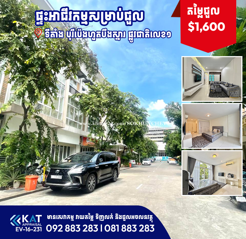 ផ្ទះអាជីវកម្មសម្រាប់ជួល | Shophouse For Rent - តម្លៃជួល | Rent Price: $1,600 - ទំហំដី | Land Size: 4.2m x 21m - ទំហំផ្ទះ | House Size: 4.2mx14m - បន្ទប់គេង | Bedroom: 4 - បន្ទប់ទឹក | Bathroom: 5 - បែរទិសជើង | North - Fully Finished -ទីតាំង/ Location: បុរីប៉េងហួតបឹងស្នោរ, សង្កាត់វាលស្បូវ, ខណ្ឌច្បារអំពៅ, រាជធានីភ្នំពេញ ។ Tel: 092883xxxClick To Call l 081883xxxClick To Call Telegram Chat : https://t.me/katappraisalsupport Telegram Channel : https://t.me/KAT_APPRAISAL