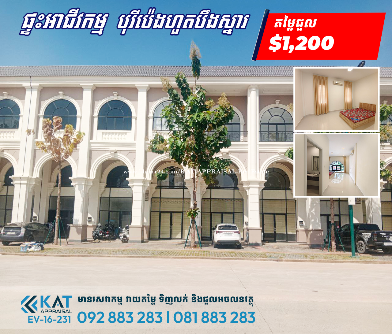 ផ្ទះអាជីវកម្មសម្រាប់ជួល | Shophouse For Rent - ស្ថិតនៅគម្រោងបុរីប៉េងហួតបឹងស្នោ លើផ្លូវធំសាន់រ៉ាយ Sunrise - តម្លៃជួល | Rent Price: $1,200 - ទំហំផ្ទះ | House Size: 4.5m x 14m - ទំហំដី | Land Size: 4.5m x 21m - បន្ទប់គេង | Bedroom: 4 - បន្ទប់ទឹក | Bathroom: 5 - Air conditioner 5, Bed and mattress, Heater water, curtain... ទីតាំង/ Location: ភូមិស្វាយតាអុក, សង្កាត់វាលស្បូវ, ខណ្ឌច្បារអំពៅ។ Tel: 092883xxxClick To Call l 081883xxxClick To Call Telegram Chat : https://t.me/katappraisalsupport Telegram Channel : https://t.me/KAT_APPRAISAL