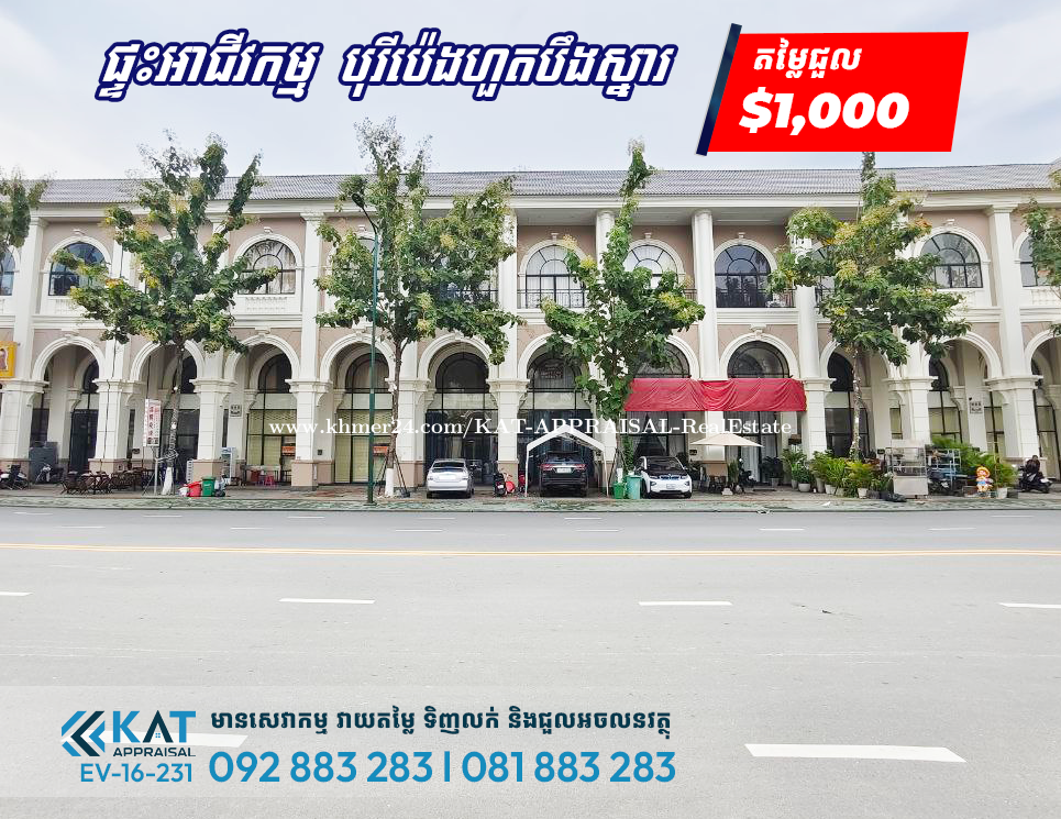 ផ្ទះអាជីវកម្មសម្រាប់ជួល | Shophouse For Rent - បុរីប៉េងហួតបឹងស្នោ, គម្រោងអេកូសាន់រ៉ាយ Eco Sunrise - តម្លៃជួល | Sale Price: $1,000 - ទំហំដី | Land Size: 4.5m x 21m - ទំហំផ្ទះ | House Size: 4.5m x 14m - បន្ទប់គេង | Bedroom: 4 - បន្ទប់ទឹក | Bathroom: 5 - បន្ទប់ទទួលភ្ញៀវៈ 1 - ផ្ទះបាយៈ 1 - ម៉ាស៊ីនត្រជាក់ ៥គ្រឿង និង វាំងននពេញ - ទីតាំង/ Location: ភូមិស្វាយតាអុក,សង្កាត់វាលស្បូវ,ខណ្ឌច្បារអំពៅ,រាជធានីភ្នំពេញ។ Tel: 092883xxxClick To Call l 081883xxxClick To Call Telegram Chat : https://t.me/katappraisalsupport Telegram Channel : https://t.me/KAT_APPRAISAL