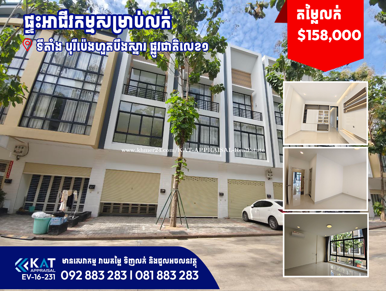 ផ្ទះអាជីវកម្មសម្រាប់លក់គម្រោងបុរីប៉េងហួតបឹងស្នោ | Shophouse For Sale - តម្លៃដាក់លក់ | Sale Price: $158,000 - ទំហំដី | Land Size: 4.2m x 19.5m - ទំហំផ្ទះ | House Size: 4.2m x 12m - បន្ទប់គេង | Bedrooms: 4 - បន្ទប់ទឹក | Bathrooms: 5 - បែរទិសកើត | East - ឯកសារ: ប្លង់រឹង | Hard - ទីតំាង/ Location: ភូមិស្វាយតាអុក, សង្កាត់វាលស្បូវ, ខណ្ឌច្បារអំពៅ។ Tel: 092883xxxClick To Call l 081883xxxClick To Call Telegram Chat : https://t.me/katappraisalsupport Telegram Channel : https://t.me/KAT_APPRAISAL
