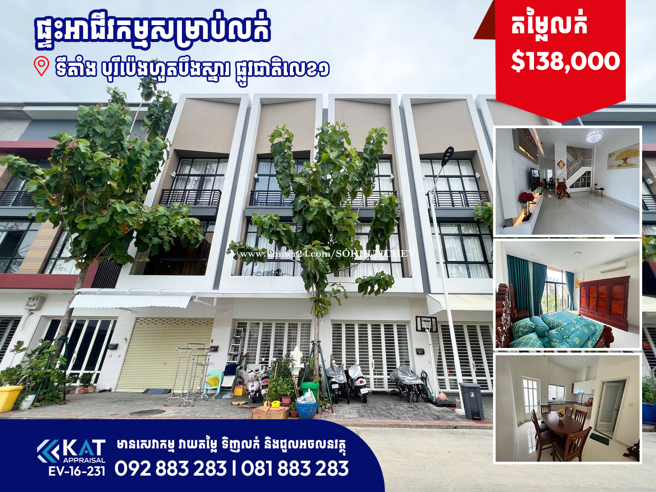 ផ្ទះអាជីវកម្មសម្រាប់លក់ | Shophouse For Sale, Sunrise -តម្លៃ | Sale Price: 138,000 ចរចា -ទំហំដី | Land Size: 4.2m X 17m -ទំហំផ្ទះ | House Size: 4.2m X 10m -បន្ទប់គេង | Bedroom: 4 -បន្ទប់ទឹក | Bathroom: 5 -បន្ទប់ទទទួលភ្ញៀវ | Living Room: 1 -ផ្ទះបាយ | Kitchen: 1 -ឯកសារ | Doc: ត្រឹមបុរី, Borey -មានចំណូលប្រចាំខែ ទីតាំង បុរីប៉េងហួតបឹងស្នោសង្កាត់វាលស្បូវ ខណ្ឌច្បារអំពៅ រាជធានីភ្នំពេញ។ Tel: 092883xxxClick To Call l 081883xxxClick To Call Telegram Chat : https://t.me/katappraisalsupport Telegram Channel : https://t.me/KAT_APPRAISAL