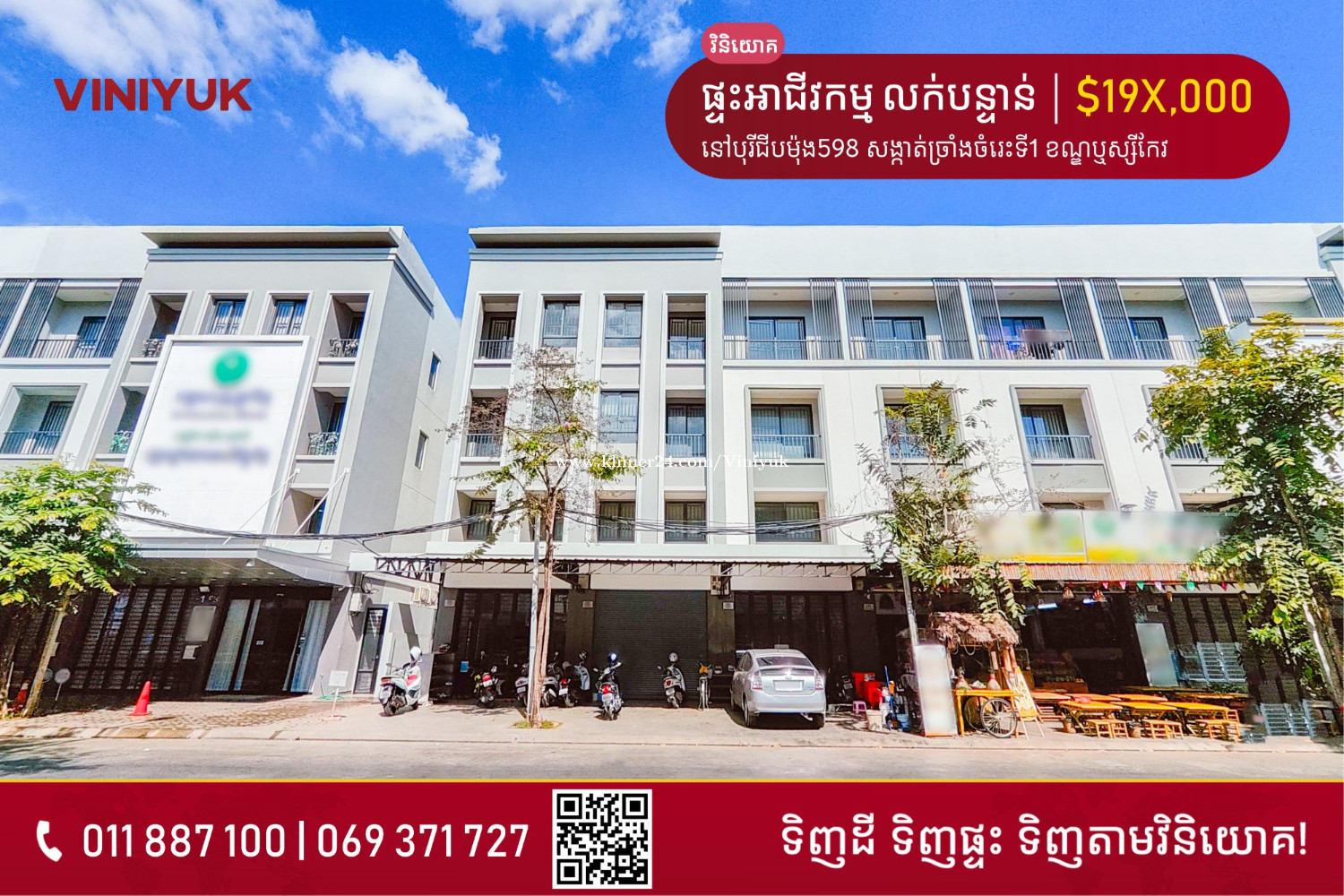 🏡ផ្ទះអាជីវកម្ម លើផ្លូវភ្លោះ លក់បន្ទាន់!! 📍ទីតាំង ៖ នៅបុរីជីបម៉ុង598 សង្កាត់ច្រាំងចំរេះទី១ ខណ្ឌឬស្សីកែវ រាជធានីភ្នំពេញ - តម្លៃលក់ : $19X,000 ចរចា - ទំហំដី : 4.2m x 24m - ទំហំផ្ទះ : 4.2m x 16m - បន្ទប់គេង 5, បន្ទប់ទឹក 6 - សម្ភារ:មិនមាន - លេខអាជ្ញាប័ណ្ណ : E-22-404