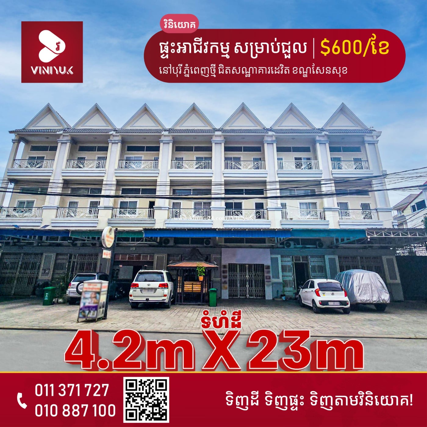 🏡ផ្ទះអាជីវកម្ម សម្រាប់ជួល!! 📍ទីតាំង ៖ នៅបុរីភ្នំពេញថ្មី ជិតសណ្ឋាគារដេវិត ខណ្ឌសែនសុខ - តម្លៃជួល: $600/ខែ ចរចា - ទំហំដី : 4.2m x 23m - ទំហំផ្ទះ : 4.2m x 18m - បន្ទប់គេង 4, បន្ទប់ទឹក 5 - ទិសលិច - លេខអាជ្ញាប័ណ្ណ : E-22-404