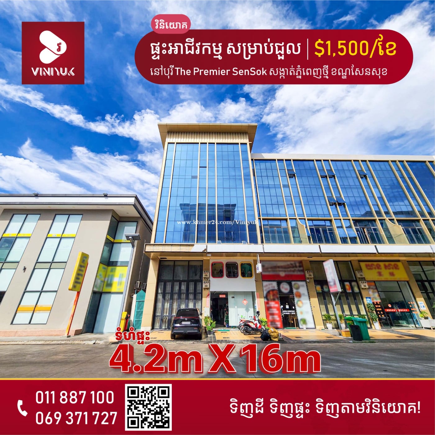 🏡ផ្ទះអាជីវកម្ម សម្រាប់ជួល!! 📍ទីតាំង ៖ : នៅបុរី The Premier SenSok សង្កាត់ភ្នំពេញថ្មី ខណ្ឌសែនសុខ - តម្លៃជួល : $1,500/ខែ - ទំហំផ្ទះ : 4.5x 16m ,សល់ចំហៀង 1.2m - បន្ទប់គេង 7 បន្ទប់ទឹក 7 - ផ្ទះបាយ 1(មានម៉ាស៊ីនត្រជាក់1(2.5m) , កន្លែងទទួលភ្ញៀវ 1 - មានសំភារៈ ៖ ម៉ាស៊ីនត្រជាក់ 6 គ្រឿង ,តុបាយ ,សាឡុង - លេខអាជ្ញាប័ណ្ណ : E-22-404