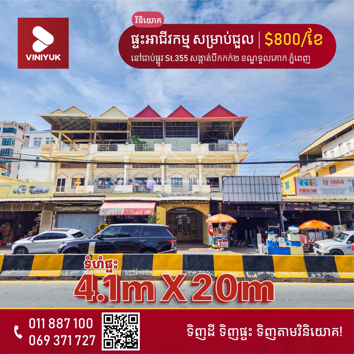🏡ផ្ទះអាជីវកម្ម សម្រាប់ជួល!! 📍ទីតាំង ៖ នៅជាប់ផ្លូវ St.355 សង្កាត់បឹកកក់២ ខណ្ឌទួលគោក រាជធានីភ្នំពេញ - តម្លៃជួល : $800/ខែ - ទំហំផ្ទះ : 4.1m x 20m ,សល់ដីក្រោយ 1.5m - បន្ទប់គេង 4 បន្ទប់ទឹក 4 - ផ្ទះបាយ , កន្លែងទទួលភ្ញៀវ 1 - មានសំភារៈ ៖ ម៉ាស៊ីនត្រជាក់ ១ , គ្រែដេក 3 - លេខអាជ្ញាប័ណ្ណ : E-22-404