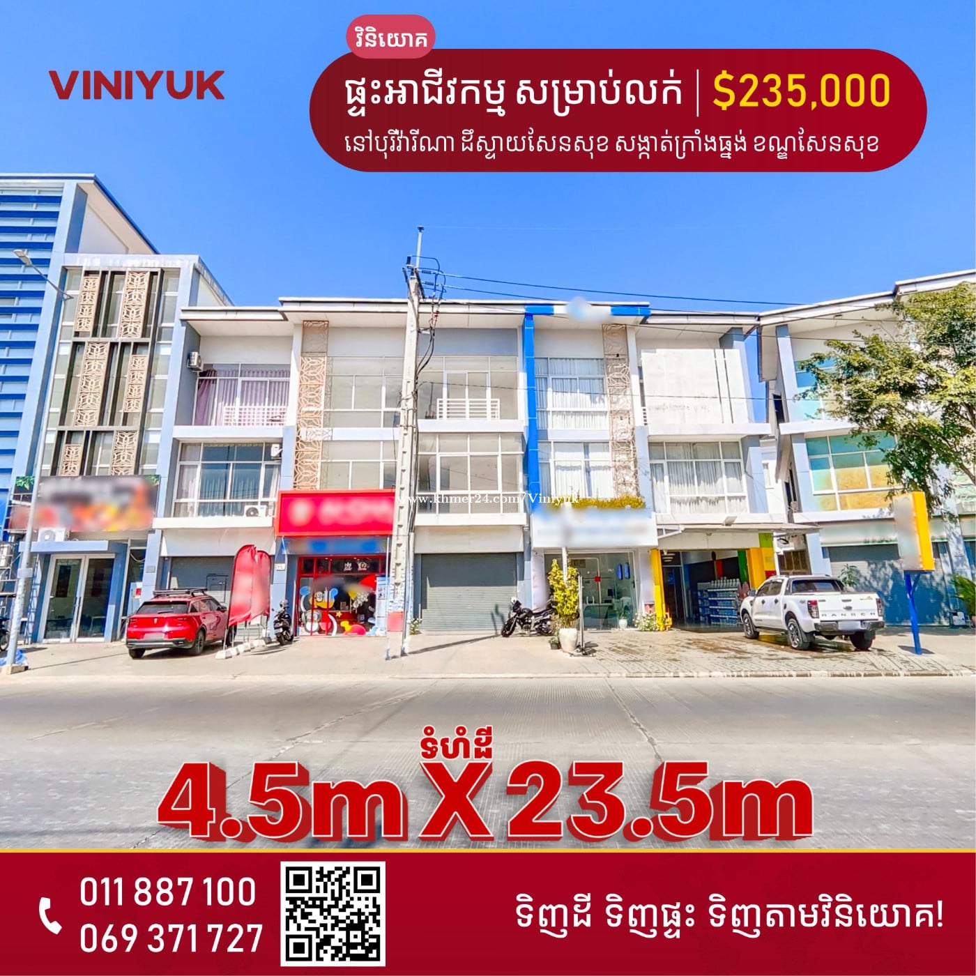🏡ផ្ទះអាជីវកម្ម សម្រាប់លក់!! 📍ទីតាំង ៖ នៅបុរីវ៉ារីណា ដឹស្ទាយសែនសុខ សង្កាត់ក្រាំងធ្នង់ ខណ្ឌសែនសុខ - តម្លៃលក់ : $235,000 ចរចា - ទំហំដី : 4.5m x 23.5m - ទំហំផ្ទះ : 4.5m x 16m - បន្ទប់គេង 4, បន្ទប់ទឹក 5 - ប្លង់ រឹង - លេខអាជ្ញាប័ណ្ណ : E-22-404