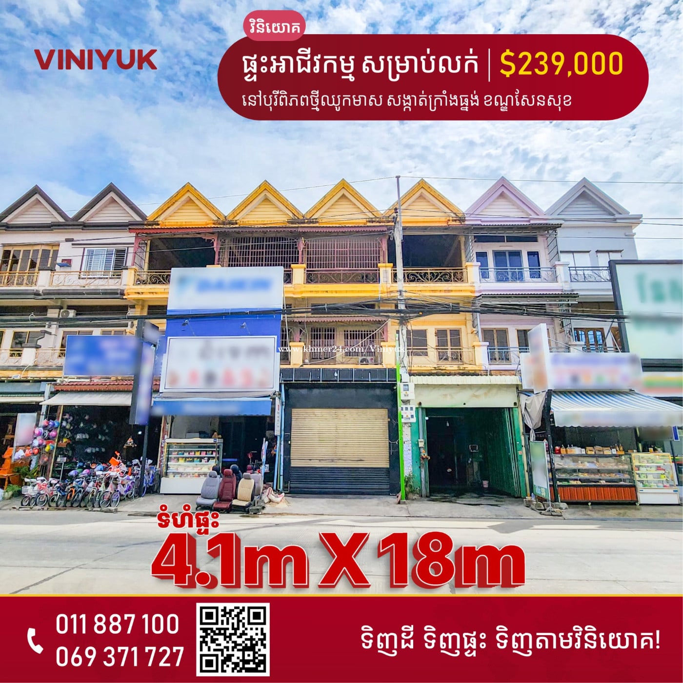 🏡ផ្ទះអាជីវកម្ម សម្រាប់លក់!! 📍ទីតាំង ៖ នៅបុរីពិភពថ្មីឈូកមាស សង្កាត់ក្រាំងធ្នង់ ខណ្ឌសែនសុខ រាជធានីភ្នំពេញ - តម្លៃលក់ : $239,000 ចរចា - ទំហំផ្ទះ : 4.1m x 18m ,សល់ក្រោយ 1.5m - បន្ទប់គេង 5 បន្ទប់ទឹក 6 - ទីតាំងសក្តានុពល អាចរកស៊ីបាន , លក់អនឡាញ ,លក់ដូរ ,បើកសាឡន ,លកដូរ... - លេខអាជ្ញាប័ណ្ណ : E-22-404