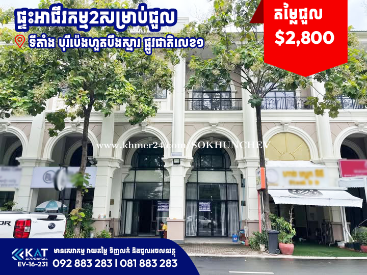 ផ្ទះអាជីវកម្ម(2 Flat)សម្រាប់ជួលលើផ្លូវក្លាស្ទ័រ l Shophouse For Rent, - តម្លៃជួល | Rent Price: $2,800/month - ទំហំផ្ទះ | House Size: 9m x 14m - ទំហំដី | Land Size: 9m x 21m - បន្ទប់គេង | Bedroom: 8 - បន្ទប់ទឹក | Bathroom: 10 - បន្ទប់ទទួលភ្ញៀវ | Living: 2 - ផ្ទះបាយ | Kitchen: 2 - កំពស់ 3ជាន់ | E0E1E2 - កុងត្រា 1ឆ្នាំ (កក់2ខែ) -ទីតាំង/ Location: បុរីប៉េហួតបឹងស្នោរ, សង្កាត់វាលស្បូវ, ខណ្ឌច្បារអំពៅ, រាជធានីភ្នំពេញ ។ Tel: 092883xxxClick To Call l 081883xxxClick To Call Telegram Chat : https://t.me/katappraisalsupport Telegram Channel : https://t.me/KAT_APPRAISAL
