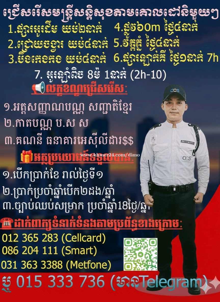 🛡️ ឱកាសការងារ៖ ជ្រើសរើសបុគ្គលិកសន្តិសុខទាំង២ភេទ បន្ទាន់! 🚨 ក្រុមហ៊ុន OCS កំពុងស្វែងរកបេក្ខជនដែលមានភាពស្មោះត្រង់ ម៉ឺងម៉ាត់ និងមានការទទួលខុសត្រូវខ្ពស់ ដើម្បីចូលរួមជាភ្នាក់ងារសន្តិសុខប្រចាំការនៅ "គោលដៅនិមួយៗ"។ ១. តួនាទី និងភារកិច្ចចម្បង -អនុវត្តការល្បាតតាមការកំណត់នៅបរិវេណខាងក្នុង។ -រៀបចំម៉ូតូ និងយានយន្ត រក្សានូវសណ្តាប់ធ្នាប់ និងសុវត្ថិភាពនៅក្នុងទីតាំង។ ២. លលក្ខខណ្ឌតម្រូ •អាយុ: ពី ១៨ឆ្នាំ ដល់ ៥៥ ឆ្នាំ •កាយសម្បទា: មានសុខភាពល្អ និងកម្លាំងមាំមួន (កម្ពស់យ៉ាងតិច ១.៦០ ម៉ែត្រឡើង)។ •បទពិសោធន៍: គ្មានបទពិសោធន៍អាចហ្វឹកហាត់បាន (បើមាន ផ្តល់អាទិភាព)។ •ចំណេះដឹង: ចេះអាន និងសរសេរខ្មែរបាន •លក្ខណៈសម្បត្តិ: ស្មោះត្រង់ ម៉ឺងម៉ាត់ មានវិន័យ និងមានឆន្ទៈការងារ។ ៣. អត្ថប្រយោជន៍ដែលទទួលបាន 💰 ប្រាក់ខែ: ចាប់ពី $១៩០ ដល់ $២២០ អាចចរចាបាន •បើកប្រាក់តាមធនាគារ អេស៊ីលីដា រាល់ថ្ងៃទី១ និងប្រាក់ខ្ចីថ្ងៃទី១៥ •សម្រាក ២ថ្ងៃ ក្នុងមួយខែ •ប្រាក់បំណាច់អតីតភាពការងារ (NSSF)។ •ឯកសណ្ឋាន និងសម្ភារៈការងារ។ •ឱកាសក្នុងការបណ្តុះបណ្តាល និងឡើងតំណែង។ •ប្រាក់ឧបត្ថម្ភ បុណ្យជាតិធំៗ។ *បេក្ខជនដែលមានចំណាប់អារម្មណ៍ សូមផ្ញើ ឯកសារត្រូវភ្ជាប់: ១.អត្តសញ្ញាណប័ណ្ណច្បាប់ដើម ២.គណនី ធនាគារអេស៊ីលីដា ៣.កាត ប.ស.ស (បើមាន) 4.យោងឯកសារផ្សេងៗ (បើមាន) ទូរសព្ទ: 015333xxxClick To Call ឬ 0313633xxxClick To Call Telegram: 015333xxxClick To Call ទីតាំងក្រុមហ៊ុន: ផ្លូវលេខ២ ភូមិព្រែកតានូ សង្កាត់ចាក់អង្រែលើ ខណ្ឌមានជ័យ រាជធានីភ្នំពេញ ∆ផុតកំណត់ដាក់ពាក្យ: ថ្ងៃទី31 ខែមិនា ឆ្នាំ២០២៦ 📞 រួសរាន់ឡើង! កន្លែងមានកំណត់!