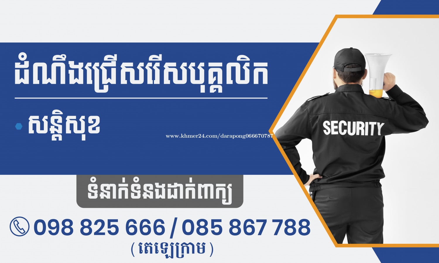 *** លក្ខខណ្ឌជ្រើសរើស ៖ - ភេទ ប្រុស អាយុចាប់ពី 18ឆ្នាំ ដល់ 45ឆ្នាំ - កំពស់ចាប់ពី 1,65ម៉ែត្រ ឡើងទៅ - ត្រូវមានភាពរហ័សរហួន ស្មោះត្រង់ - កម្រិតវប្បធម៍ (ត្រូវតែចេះអាន និងសរសេរភាសាខ្មែរបន្តិចបន្តួច) - មិនគិតពីបទពិសោធន៍ (បើមានកាន់តែល្អ) *** អត្ថប្រយោជន៍រួមមាន ៖ - ប្រាក់ខែគោល 220$ - សម្ភារៈប្រើប្រាស់សម្រាប់បំពេញការងារ (ដោយឥគិតថ្លៃ) - មានកន្លែងស្នាក់នៅ (ទឹកភ្លើងមិនគិតថ្លៃ) - ឈប់សម្រាក02ថ្ងៃក្នុងមួយខែ - មានការតម្លើងប្រាក់ខែ ទៅតាមការខិតខំប្រឹងប្រែងរបស់បុគ្គលិក ដែលយកចិត្តទុកដាក់នឹងការងារ និងមានវិន័យល្អ ។ *** ទីតាំងបំរើការងារមាន ៖ - សង្កាត់គោកឃ្លាង និងសង្កាត់ក្រាំងធ្នង់ ខណ្ឌសែនសុខ ។ *** ម៉ោងធ្វើការ ៖ - មួយថ្ងៃ 12ម៉ោង - មាន02វេន (យប់ចូលម៉ោង 06:00ល្ងាច ចេញ 06:00ព្រឹក និង វេនថ្ងៃចូលម៉ោង 06:00ព្រឹក ចេញ 06:00ល្ងាច) 069263xxxClick To Call (តេឡេក្រាម)