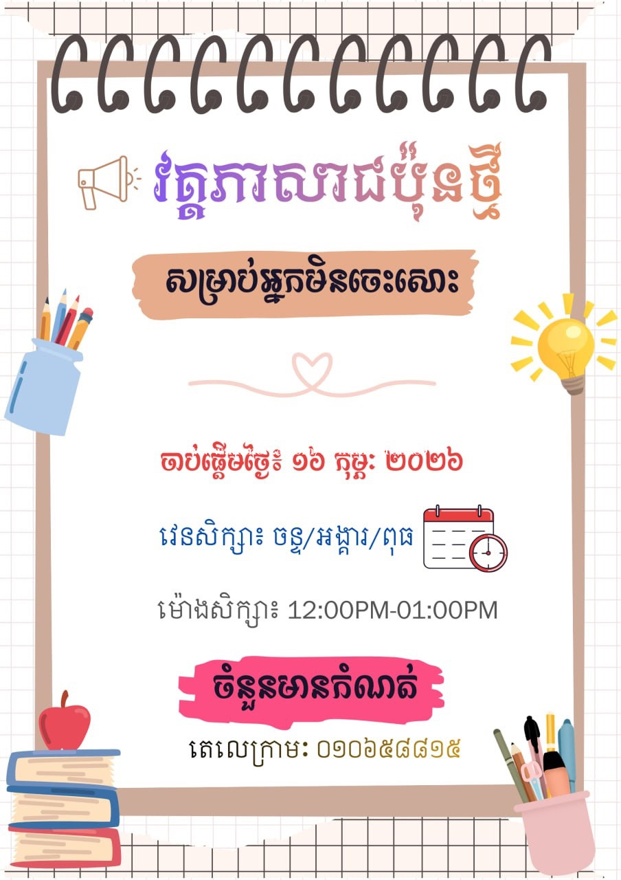 🔔ដំណឹងល្អរៀនភាសាជប៉ុនកម្រិតមិនចេះសោះ 🔔រៀនតាមZoom online ដោយមិនគិតប្រាក់ 🔔ចូលរៀនខែ២ ឆ្នាំ២០២៦ (រយៈពេល២ខែ) 👉ផ្តល់ជូនសម្រាប់សិស្ស២០នាក់តែប៉ុណ្ណោះ ☘️ទទួលចុះឈ្មោះចាប់ពិផ្សាយដំណឹងតទៅ ☘️លក្ខខណ្ឌផ្សេងៗត្រូវបានអនុវត្ត ✍️ចុះឈ្មោះតេលេក្រាម 010658xxxClick To Call